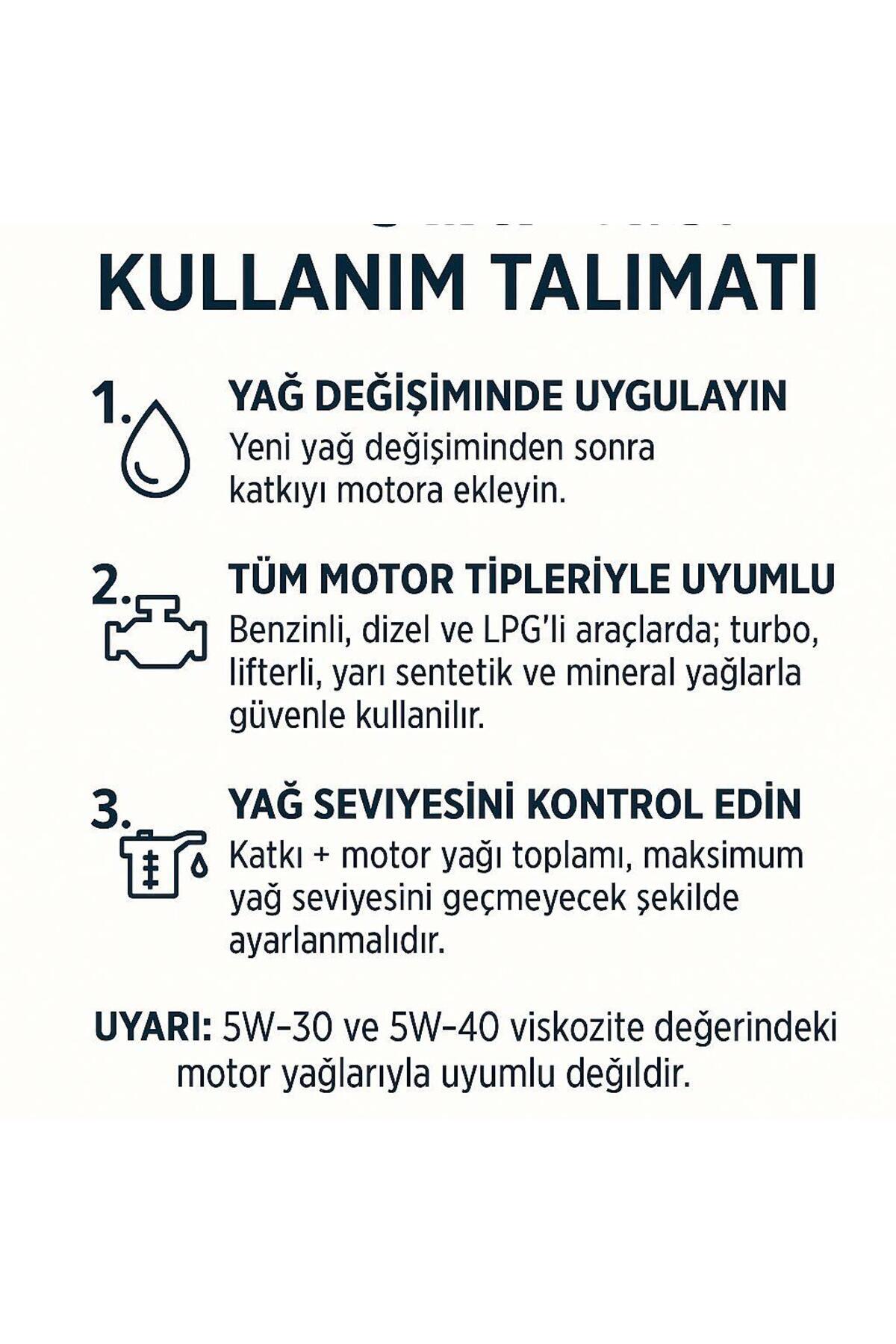 yağ yakma azaltıcı,duman azaltıcı ve aynı zamanda aşınma önleyici,koruyucu olarak kullanılır. Yeni yağ değişiminde ve ya eski yağlarda kullanılabilir. Yarı sentetik ve mineral yağlarla kullanılabilir. Benzinli, dizel ve LPG'li araçlarda kullanılabilir. Uygulama Katkı ve yağ toplamı yağ seviyesi maksimum çizgisini geçmeyecek şekilde yap seviyesini ayarlayın. Motoru ısıtıp stop ettikten sonra yağ kapağından kutunun tamamını boşaltın. Motoru 5 dakika çalıştırarak katkı ile yağın homojen şekilde karışmasını sağlayın. Dozaj 4-7 lt. arası yağ alan araçlarda 444 ml.'lik kutunun tamamını, 7-12 lt. arası yağ alan araçlarda 800 ml.'lik kutunun tamamını, 12 lt.'den fazla yağ alan araçlarda yağ kapasitesinin %7'si kadar kullanılır. İçindekiler Viskosite iyileştirici katık. Conta yumşatıcı katık. Aşırı basınç katıkları. Deterjan ve dağıtıcı katıklar. Asit giderici katık. Akma noktası düşürücü katık. Köpük önleyici katık. Üstün nitelikli baz yağlar. *5W-40 ve daha ince yağ kullanan araçların kullanımına uygun değildir.*