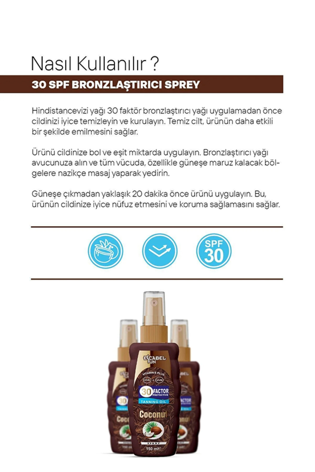 ESCABEL 30 SPF Bronzlaştırıcı Yağ – Hindistan Cevizi Özlü Öne Çıkan Özellikler: SPF 30 koruma: UVA ve UVB ışınlarına karşı etkili güneş koruması sağlar.