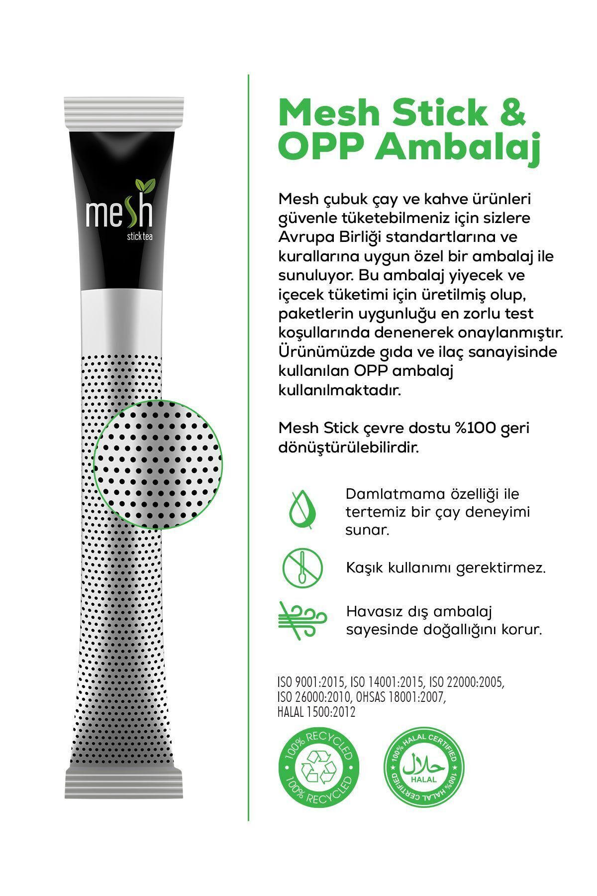 Mesh çubuk çay ve kahve ürünleri güvenle tüketebilmeniz için sizlere Avrupa Birliği standartlarına (EU 10/2011) ve kurallarına uygun özel bir ambalaj ile sunuluyor (1935/2004/EC ve 2023/2006/EC (GMP))