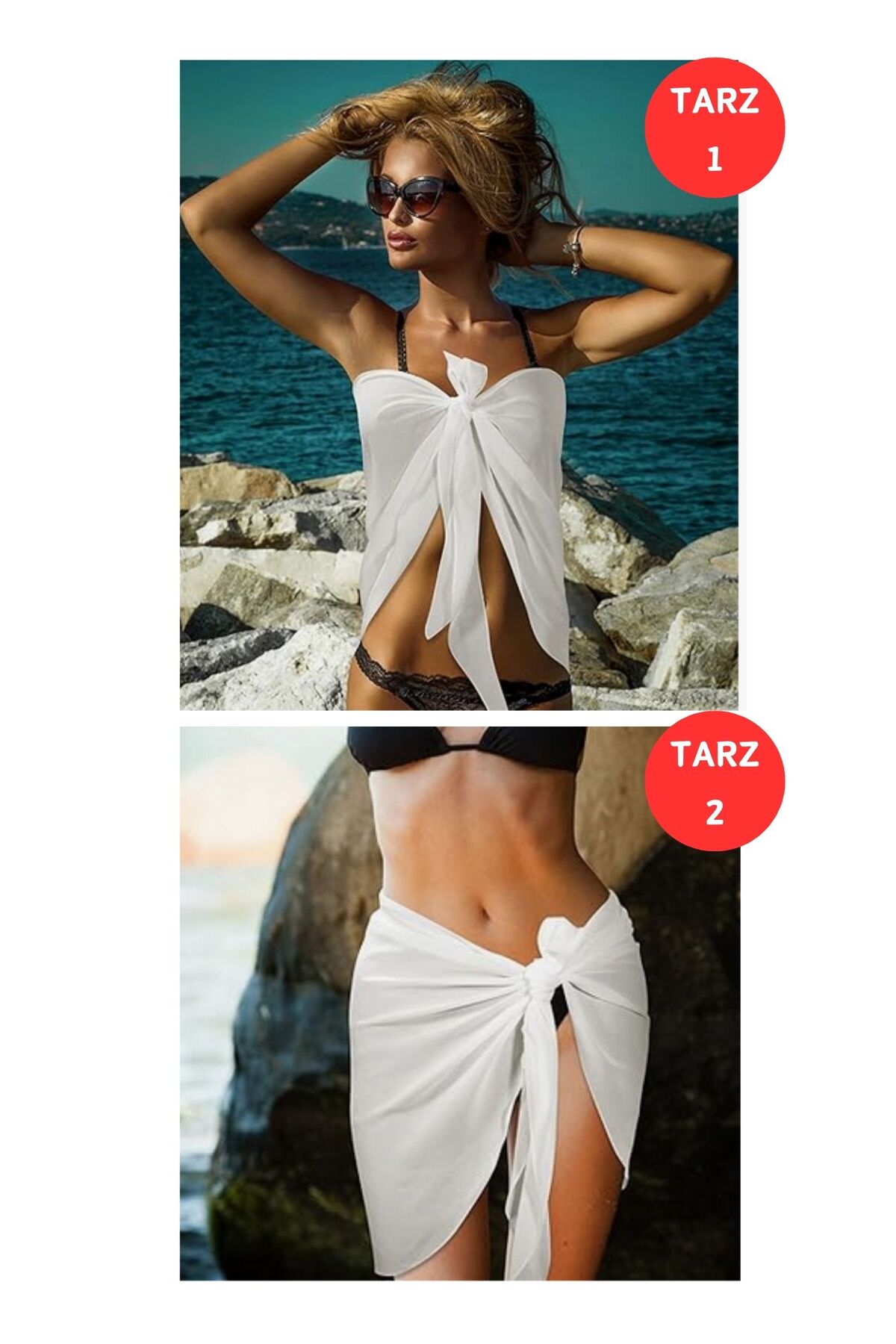 Kadın Tül Pareo Transparan Belden Bağlamalı Kadın Plaj Elbisesi Ekru. Bu plaj elbisesi, güneşin altında bronzlaşırken veya plaj barındaki bir partide şıklığınızı korumak istediğinizde mükemmel bir tercih olacaktır. Ekru rengi, enerjik ve çarpıcı bir görünüm sunarken, tül malzemesiyle hafif ve nefes alabilir bir giyim deneyimi sunar. Desen: Düz