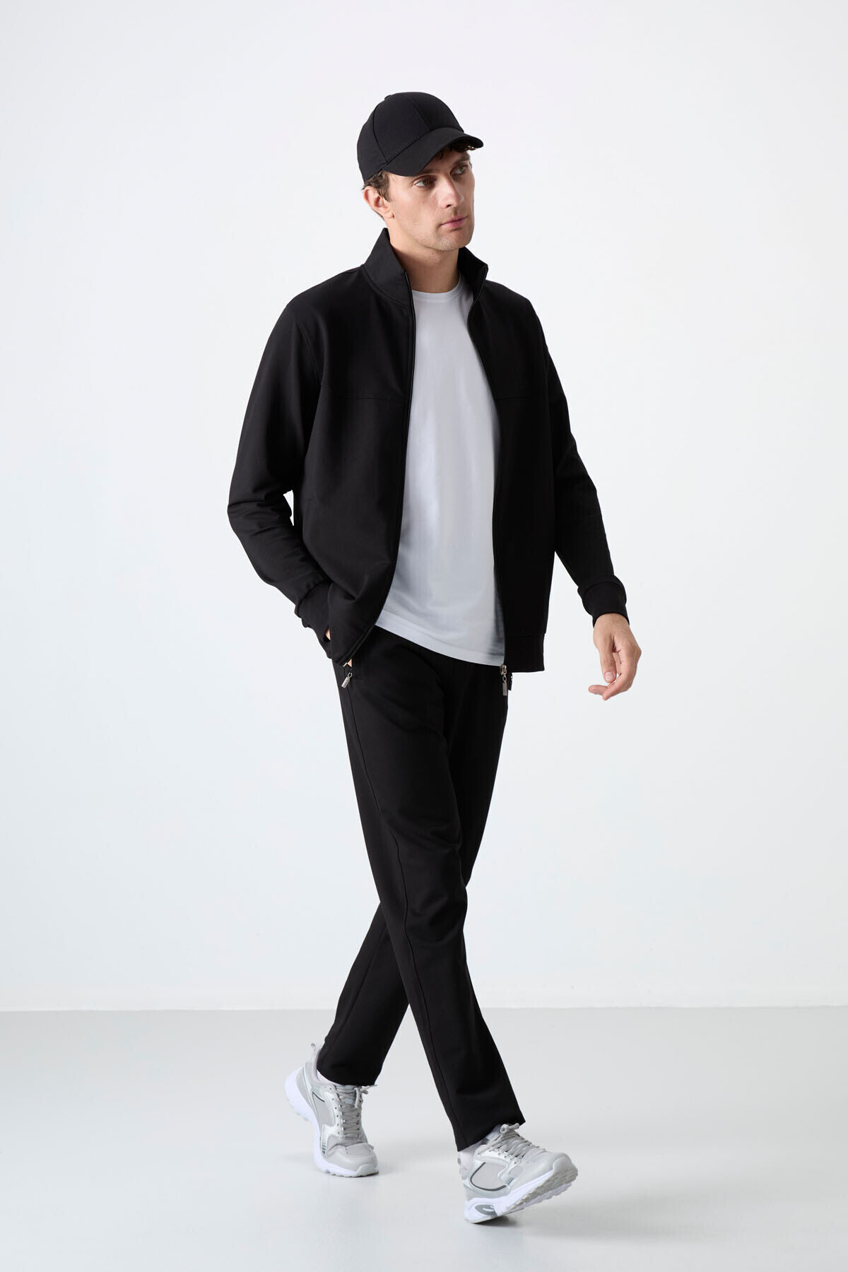 - Rahat ve şık bir görünüm için tasarlanmış, lacivert renkli düz desenli sweatshirt ve pantolon kombininden oluşan erkek eşofman takımı