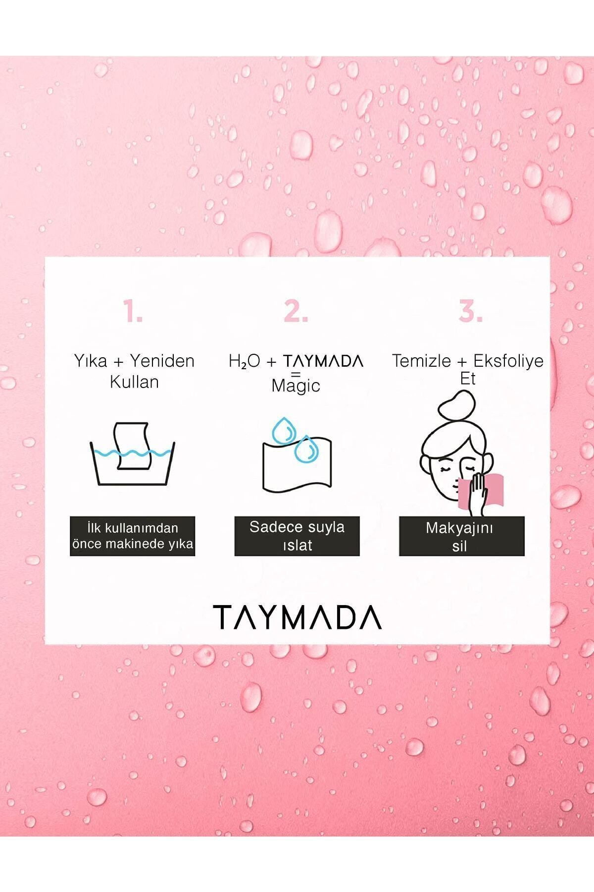 TAYMADA Makyaj Temizleyici'nin her iki yüzeyinin de farklıişlevi vardır. Kısa lifli yüzeyi ile makyajı siler ve uzun lifli yüzeyi(etiketli taraf) ile eksfoliasyon yaparak daha yumuşak, daha genç görünen bircilt için ölü hücreleri, gözenekleri temizler ve kan dolaşımını iyileştirmeyeyardımcı olarak cilde doğal ve sağlıklı bir ışıltı verir.
