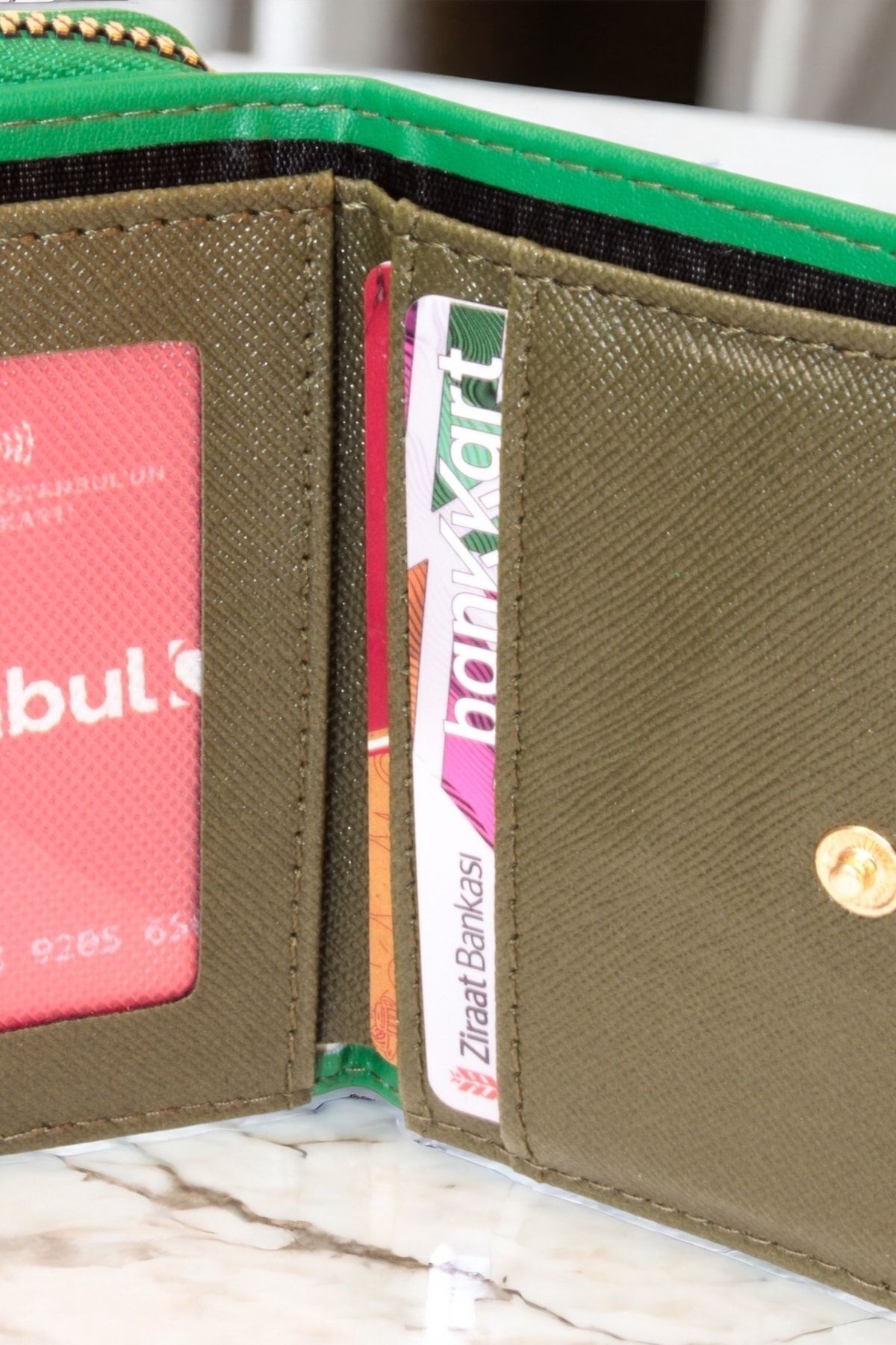 5 kart yuvası, 1 nakit bölmesi, 1 şeffaf ve 1 fermuar bölmesi bulunur.