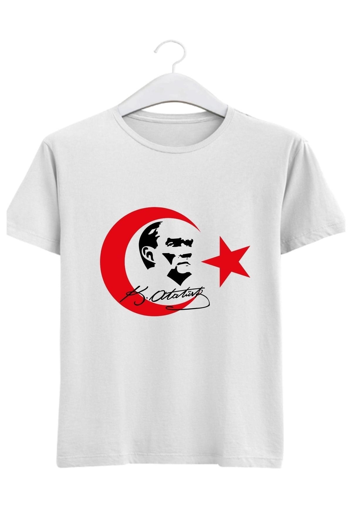 Unisex Beyaz Baskılı Türk Bayrağı Tişörtü - Atatürk ve Türk Bayrağı Tişörtü