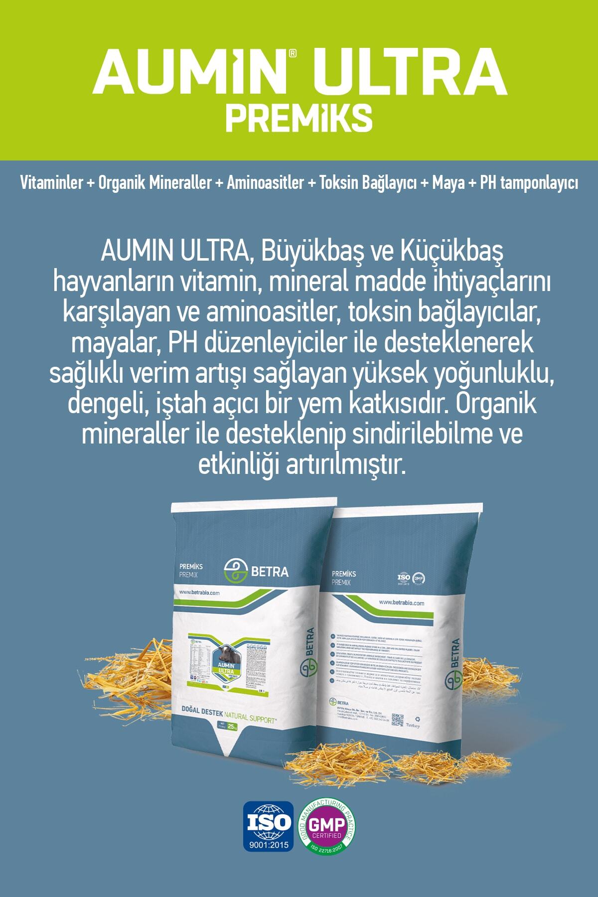 İnek, koyun ve keçi gibi ruminant hayvanların beslenme ihtiyaçlarına özel olarak formüle edilmiş, yüksek kaliteli yem katkı maddesi