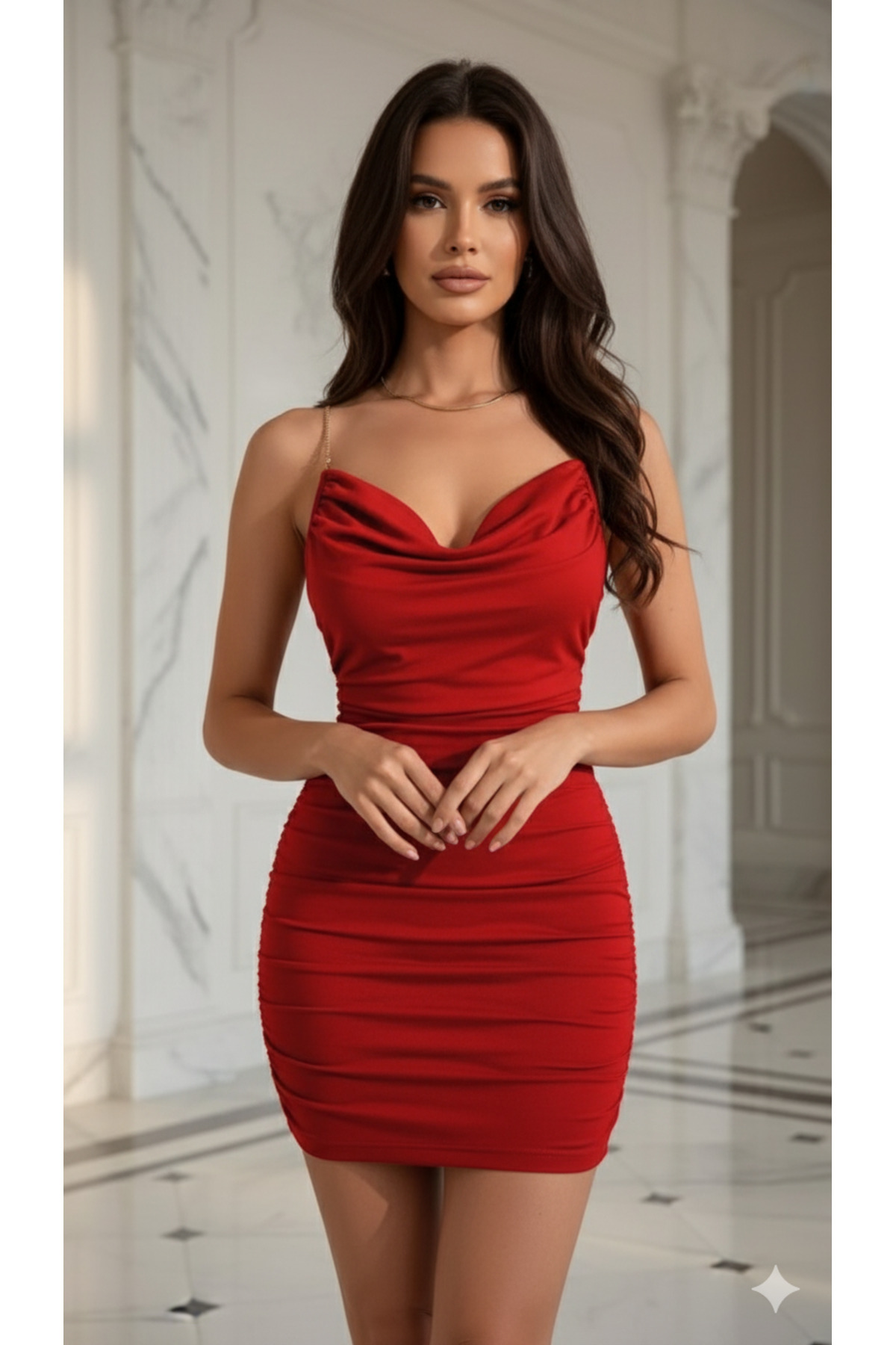 Bisiklet yakası ile modern çizgilere sahip olan bu elbise, çapraz bağlama detaylarıyla dinamik bir görünüm kazanır.