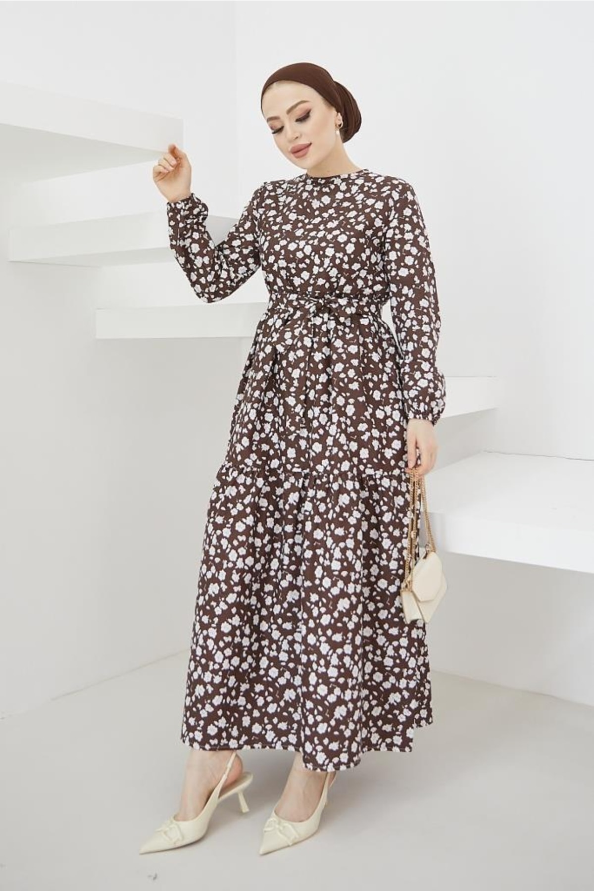 Uzun boy tasarımı ile zarif bir siluet oluştururken, çiçekli deseniyle feminen detaylar ekler