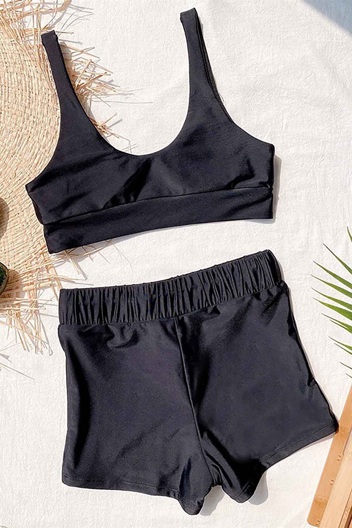 - Her yaş grubuna uygun tasarımıyla, plaj modasının vazgeçilmez parçası olan şortlu tankini bikini takımı, düz deseni ve rahat kesimiyle dikkat çeker