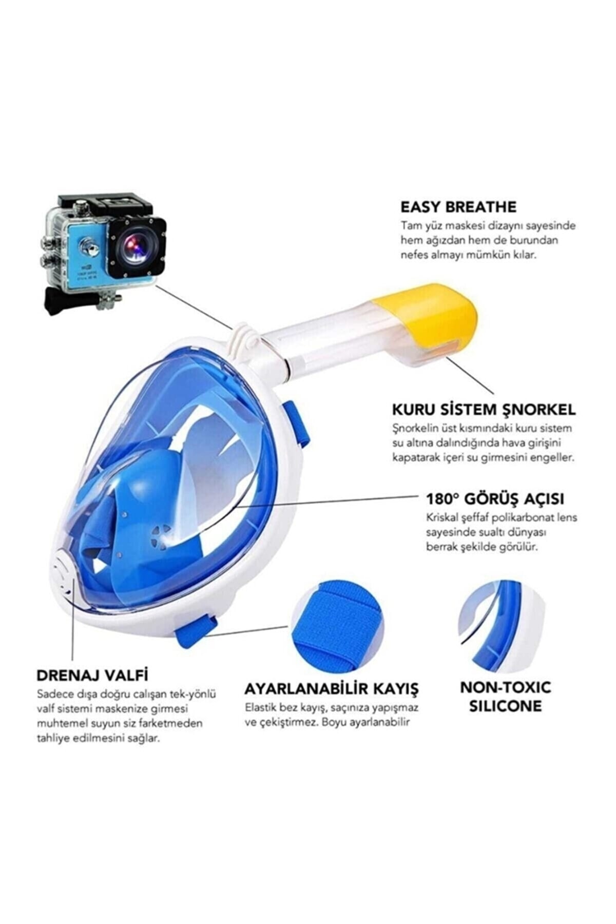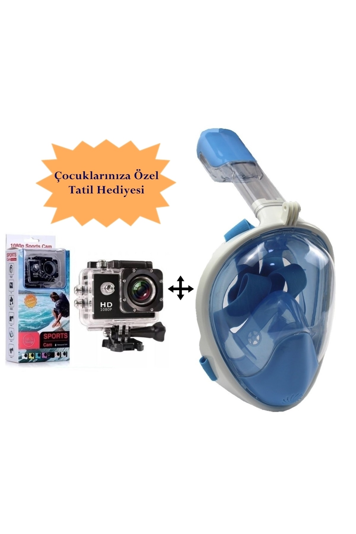 Şnorkel Full Face Mavi Dalış Maskesi 1080p Su Altı Aksiyon Kamerası Set