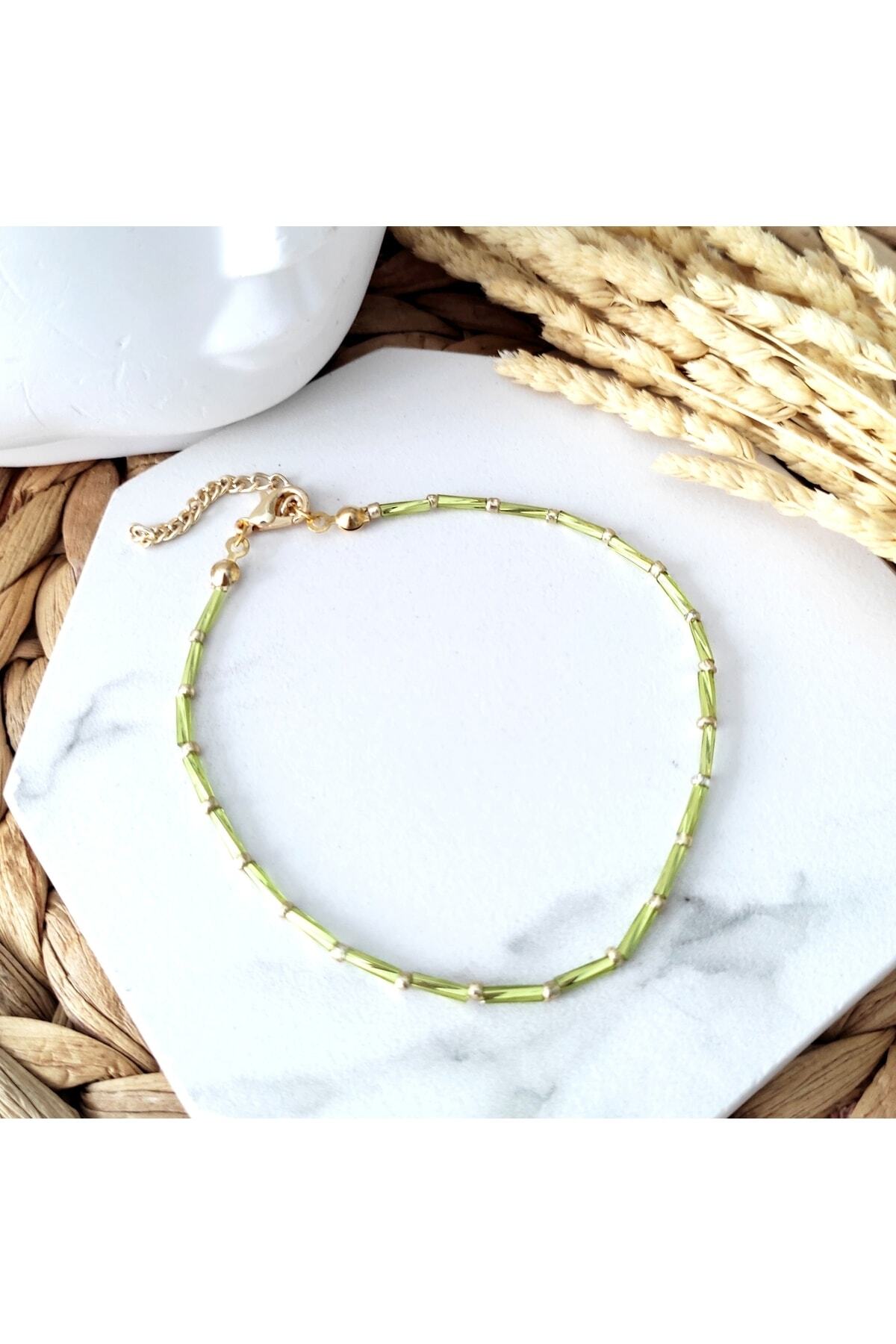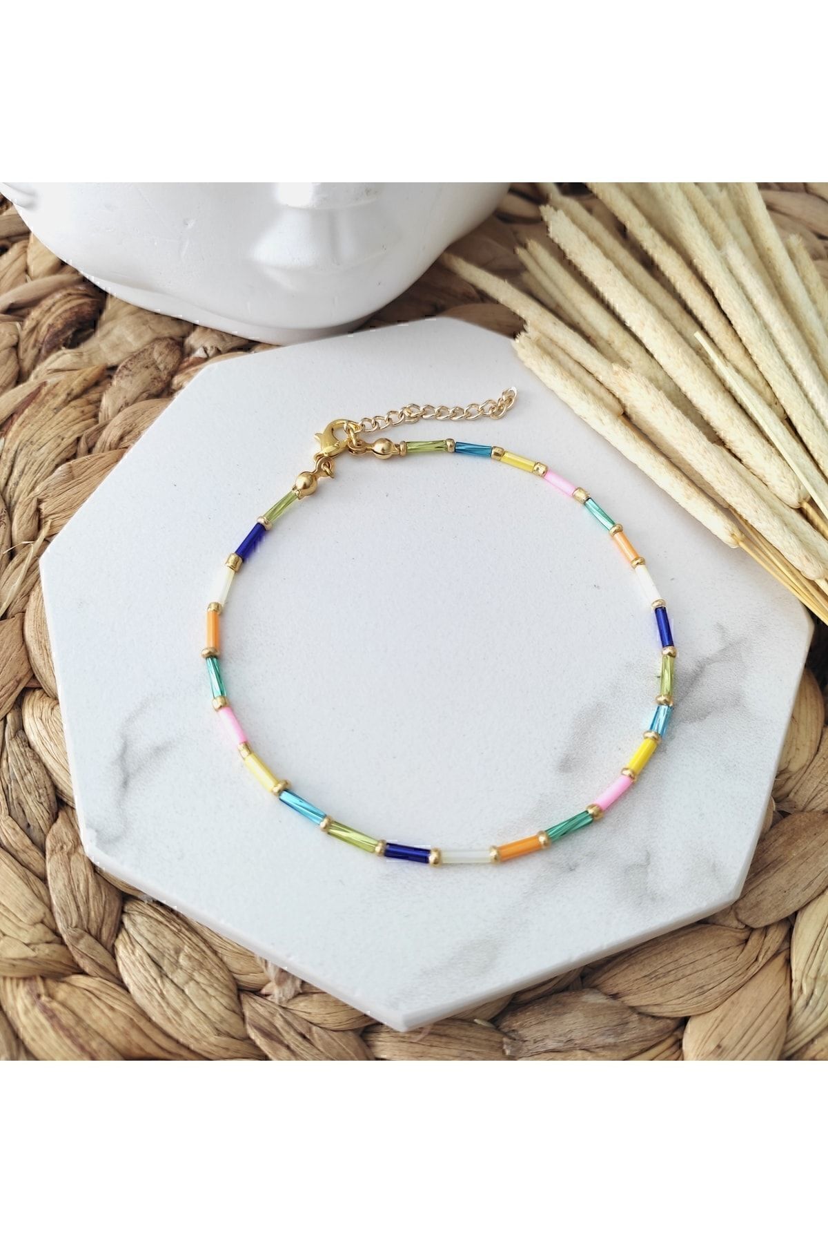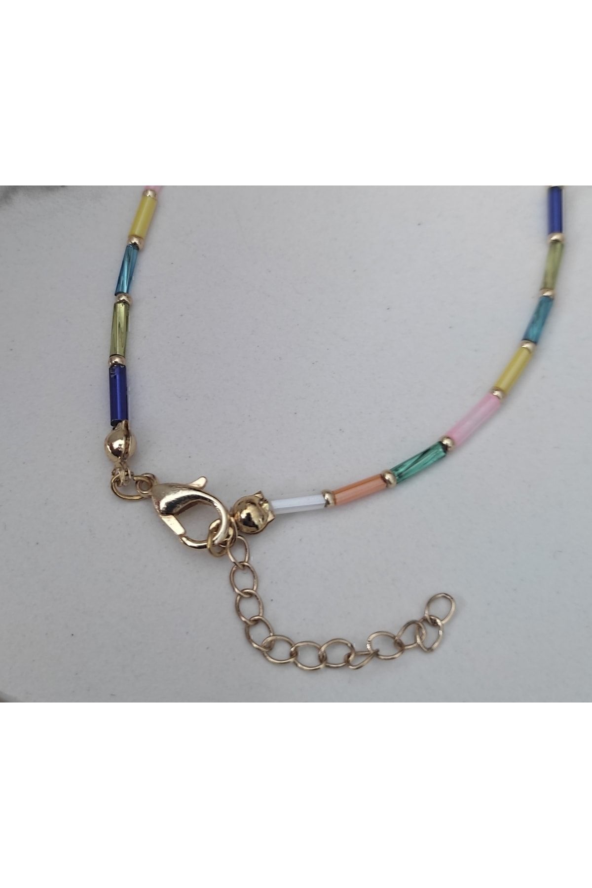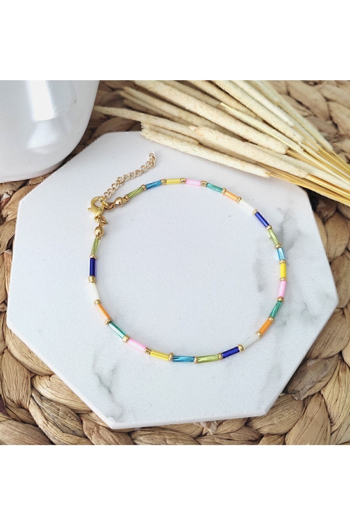 Renkli kesme çubuk boncuklar, gold renkli kum boncuklar ve lak kaplama aparatlar ile tasarlanmış boyu ayarlanabilir halhal.