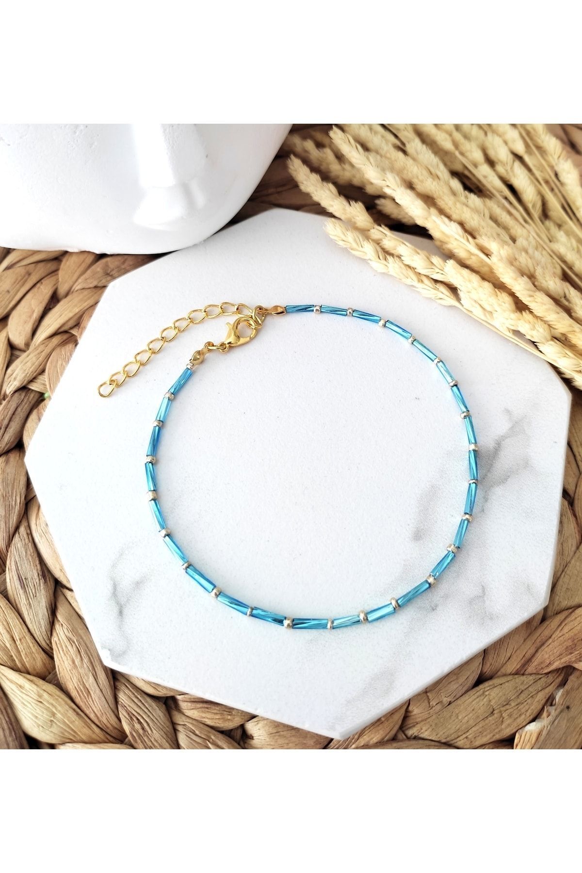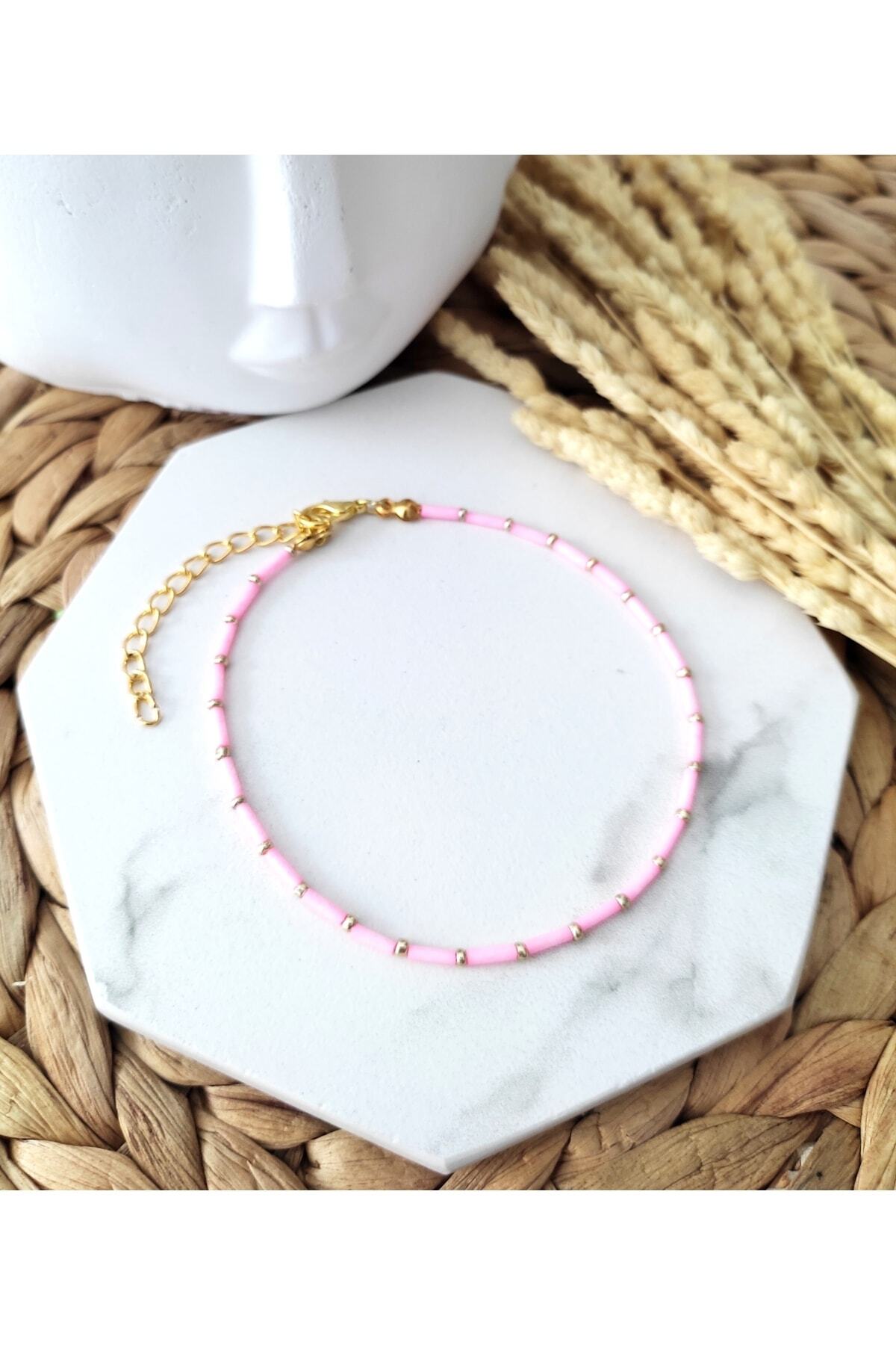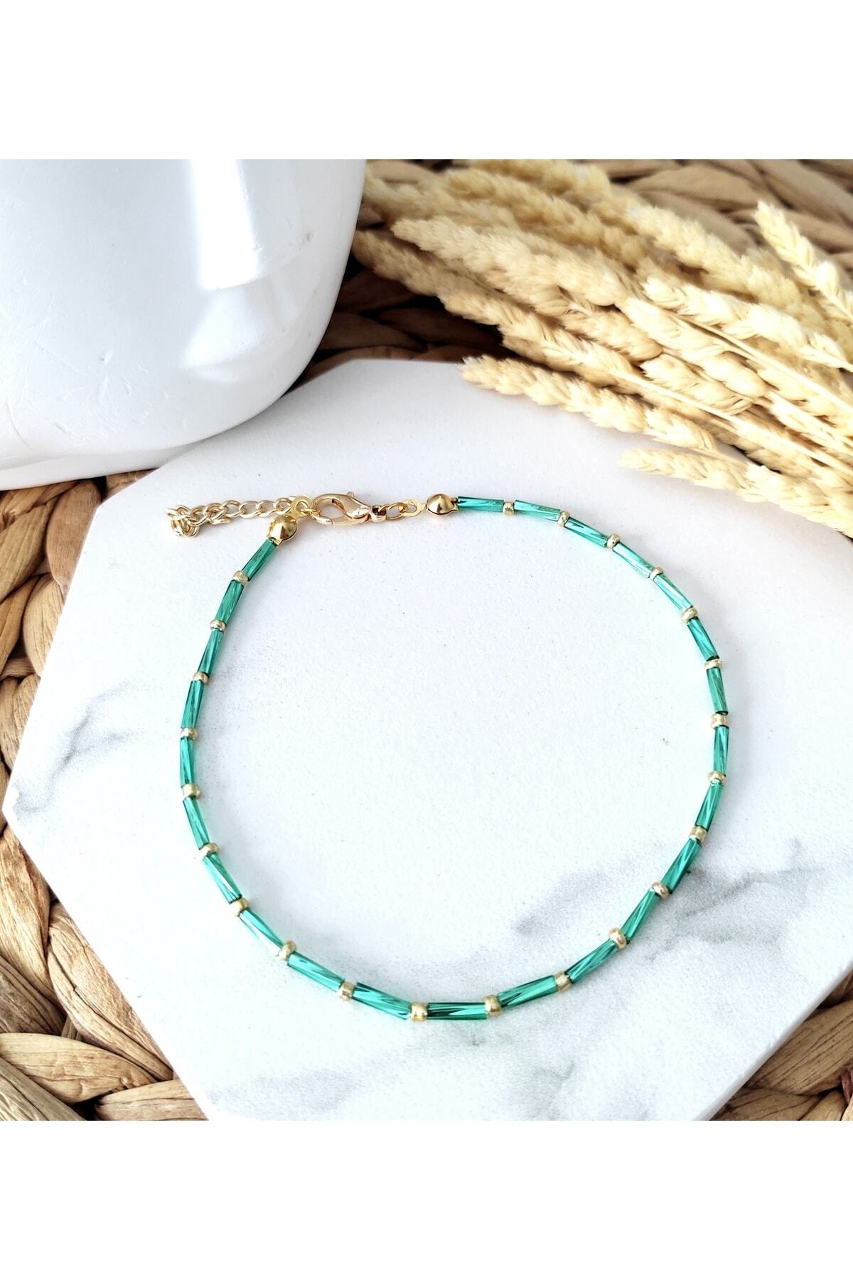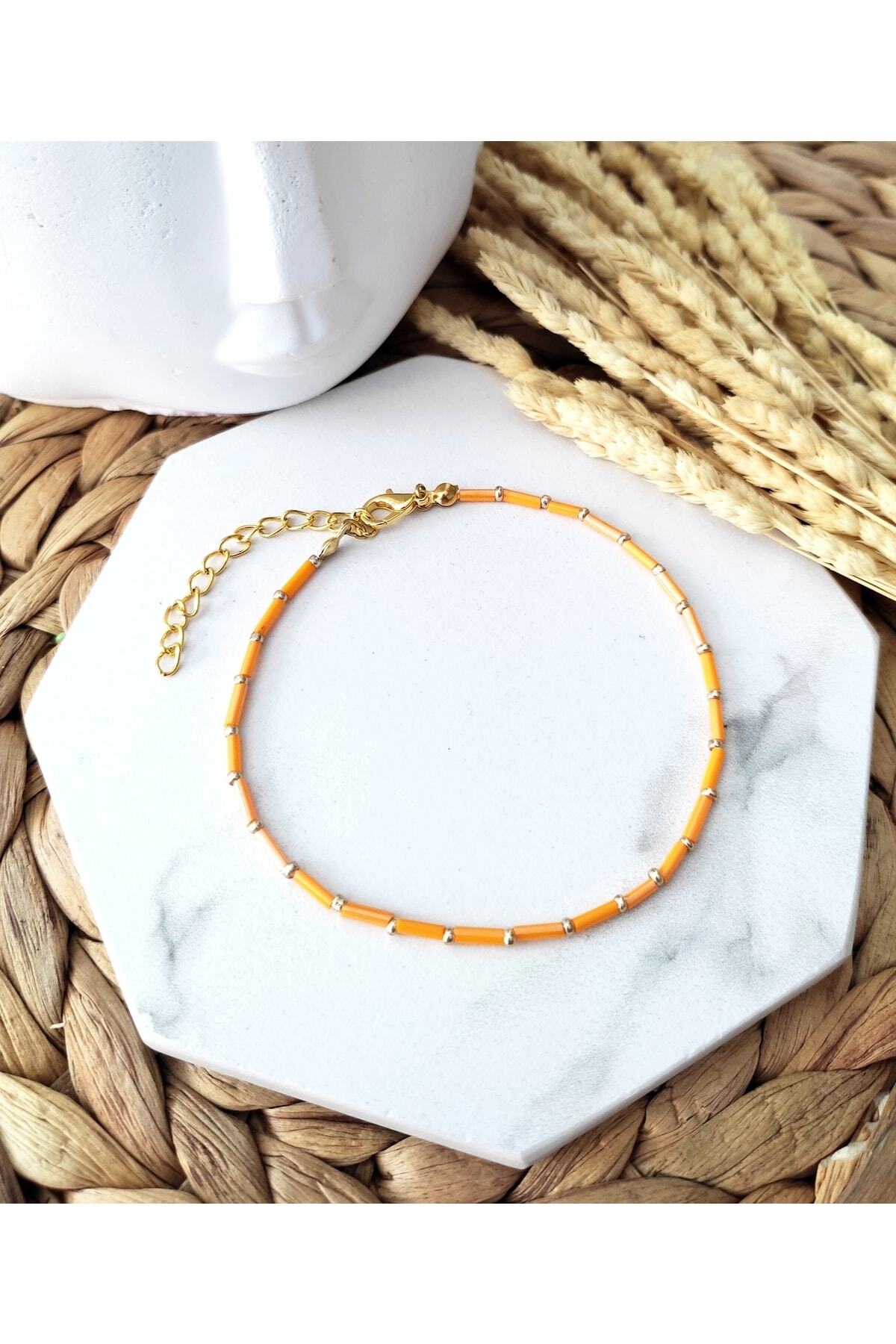 Renkli kesme çubuk boncuklar, gold renkli kum boncuklar ve lak kaplama aparatlar ile tasarlanmış boyu ayarlanabilir halhal.