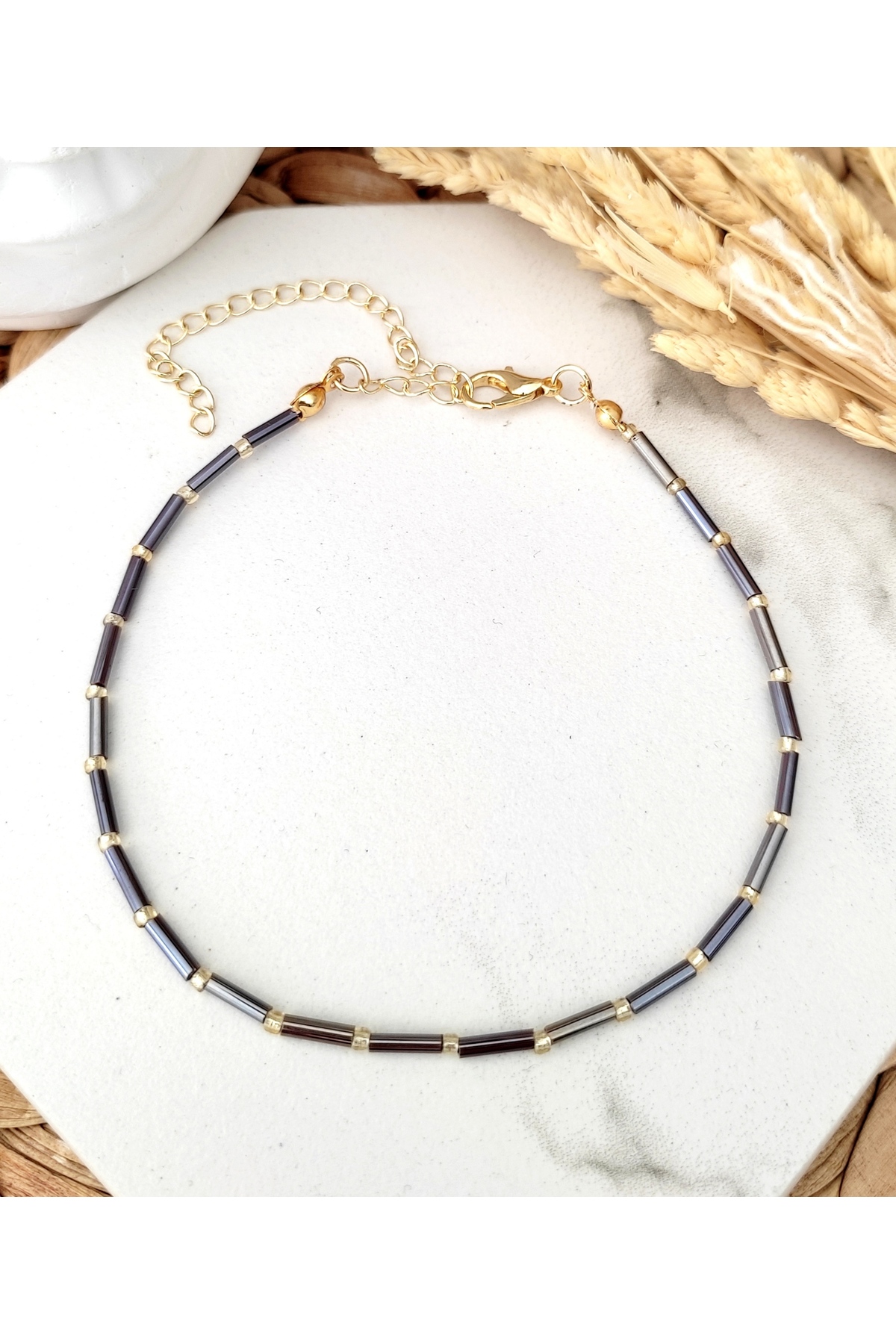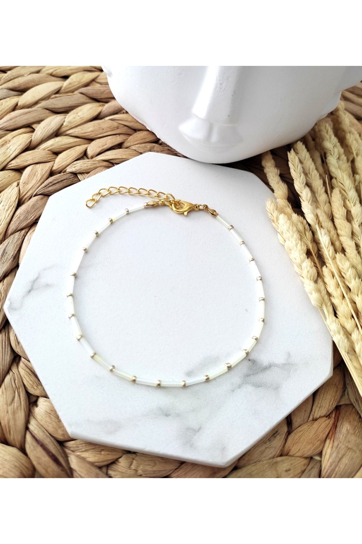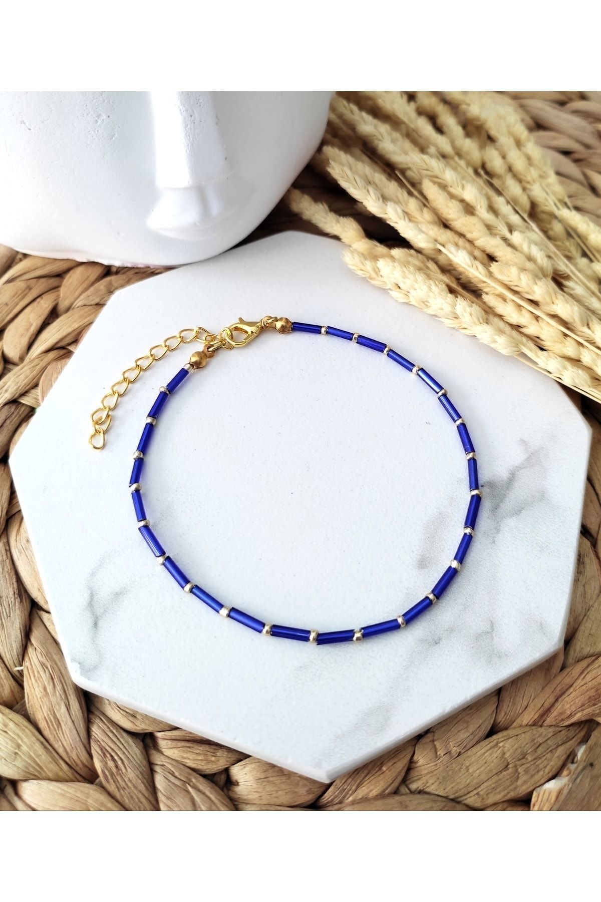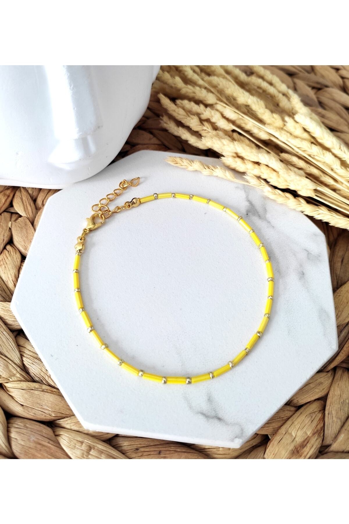 Renkli kesme çubuk boncuklar, gold renkli kum boncuklar ve lak kaplama aparatlar ile tasarlanmış boyu ayarlanabilir halhal.
