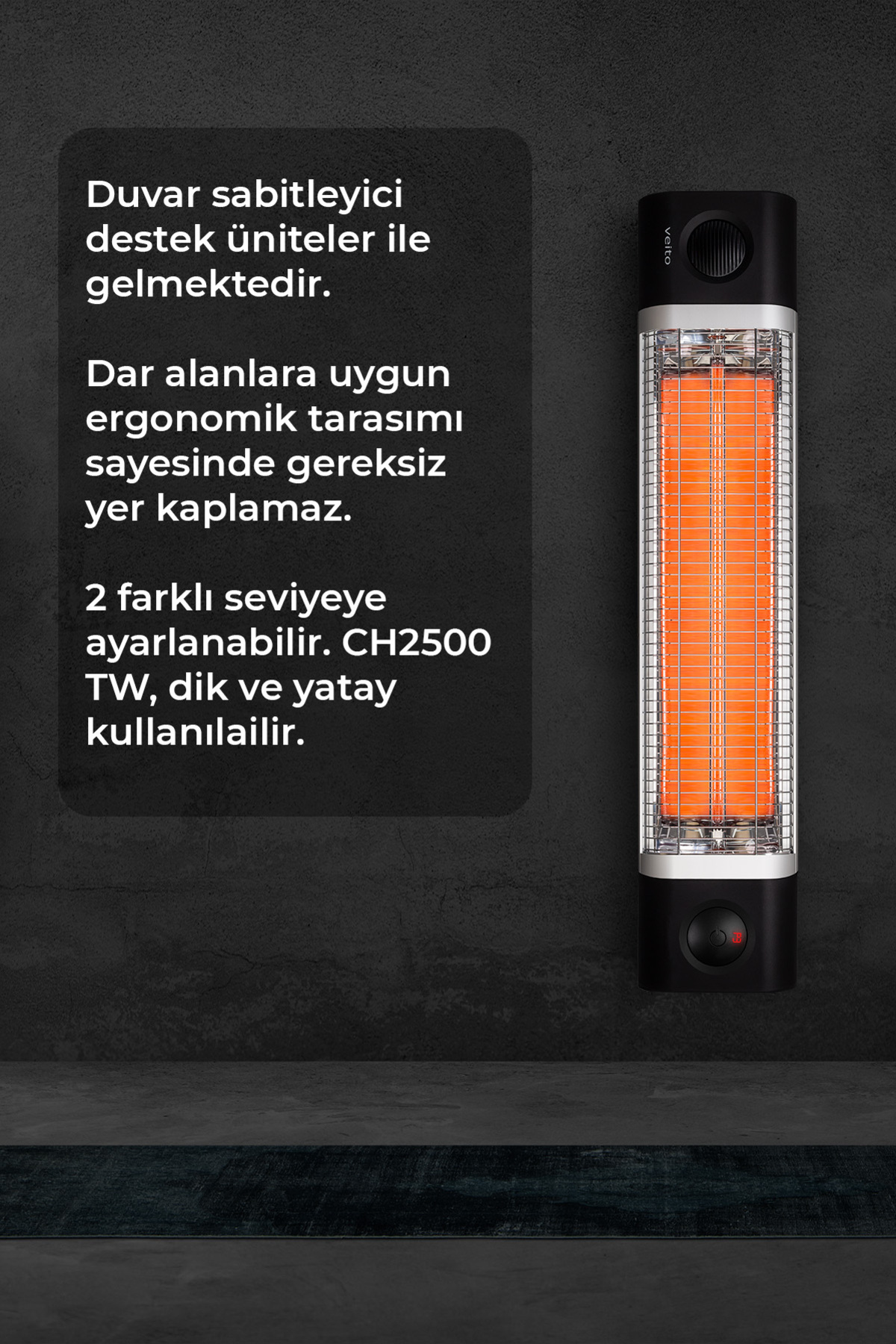 Veito CH2500 TW ısıtıcı, modern görünüşe sahip, ağır görevler için üretilmiş endüstriyel bir modeldir. Duvar sabitleyici destek üniteler ile gelmektedir. Dar alanlara uygun ergonomik tasarımı sayesinde gereksiz yer kaplamaz. Isıtma kapasitesi, 1000W, 1500W, 2000W ve 2500W olmak üzere 4 farklı seviyeye ayarlanabilir. Isıtıcı devrildiğinde kendini otomatik olarak kapatır. Uzaktan Kumanda Periskopik uzaktan kumanda sayesinde, CH2500 RW uzak mesafeden ve geniş bir alandan, bütün varolan fonksiyonları ve ayarlarıyla kontrol edilebilir. Fonksiyonları