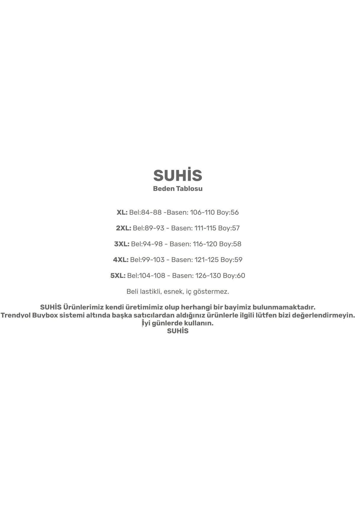 • SUHİS Beden Tablosu XL: Bel:84-88 -Basen: 106-110 Boy:56 2XL: Bel:89-93 - Basen: 111-115 Boy:57 3XL: Bel:94-98 - Basen: 116-120 Boy:58 4XL: Bel:99-103 - Basen: 121-125 Boy:59 5XL: Bel:104-108 - Basen: 126-130 Boy:60 Beli lastikli, esnek, iç göstermez.