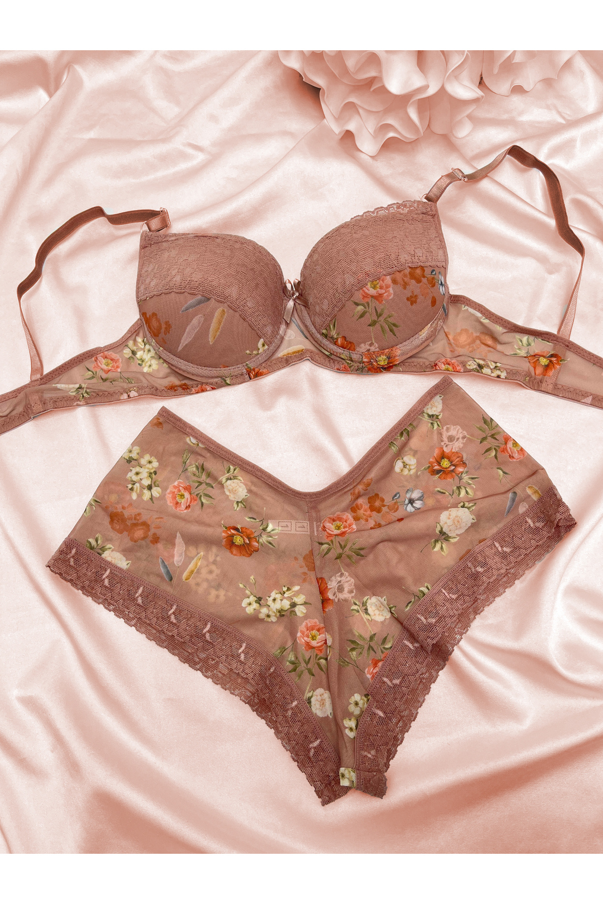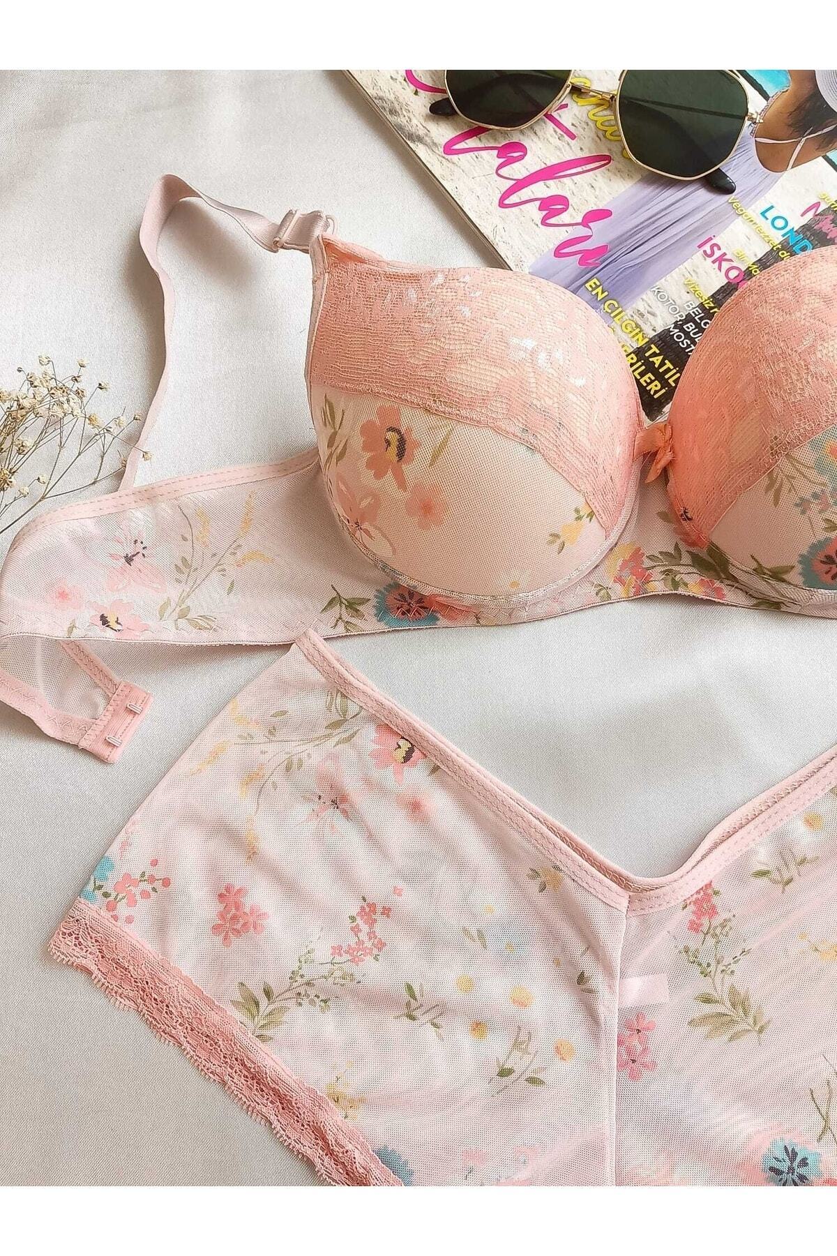 Desenli yapısıyla göz alıcı bir stil sunan bu iç çamaşır takımı, çiçek desenleriyle feminen detayları ön plana çıkarır