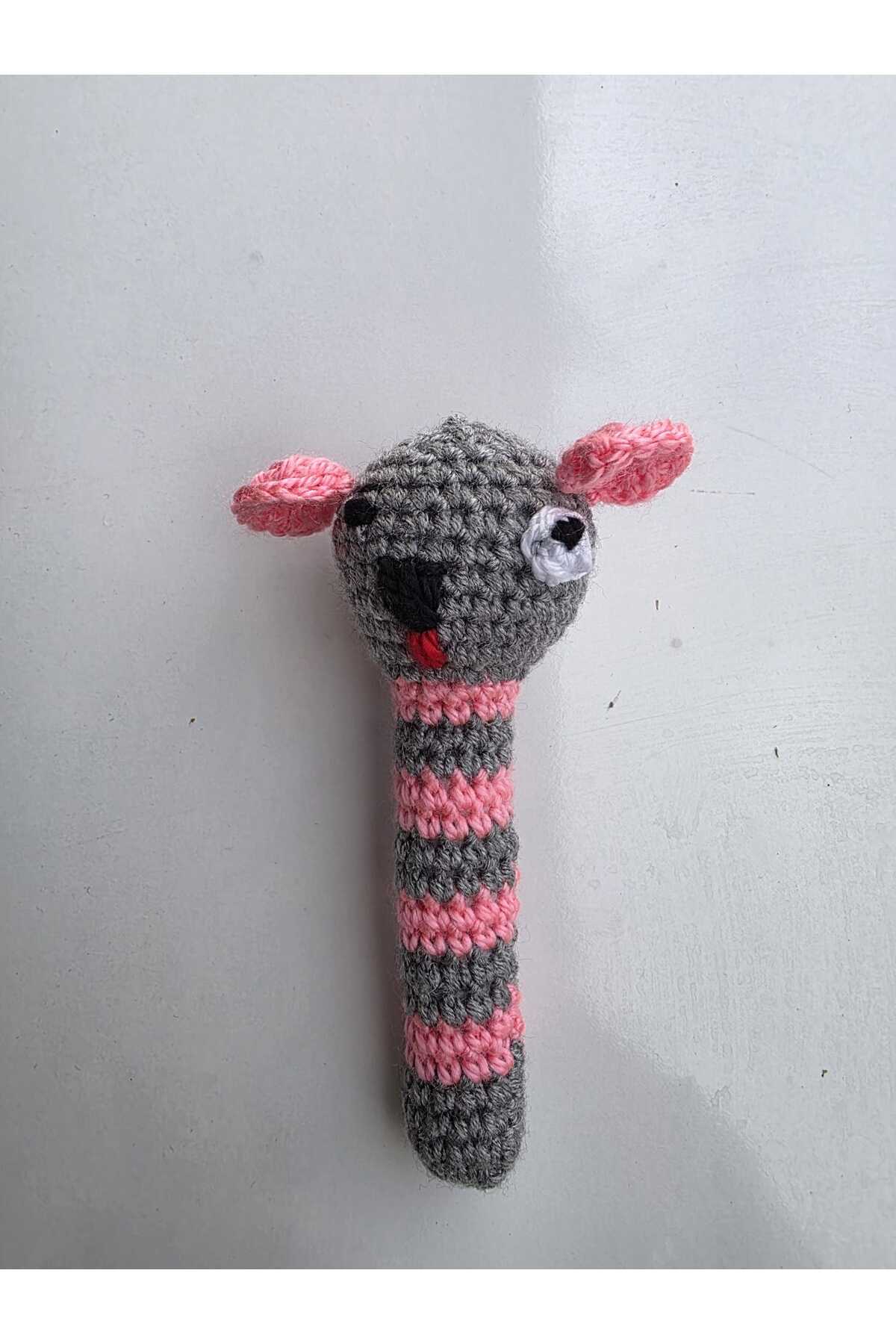 Pembe ve gri renkli ipler ile sevgiyle örülmüştür.