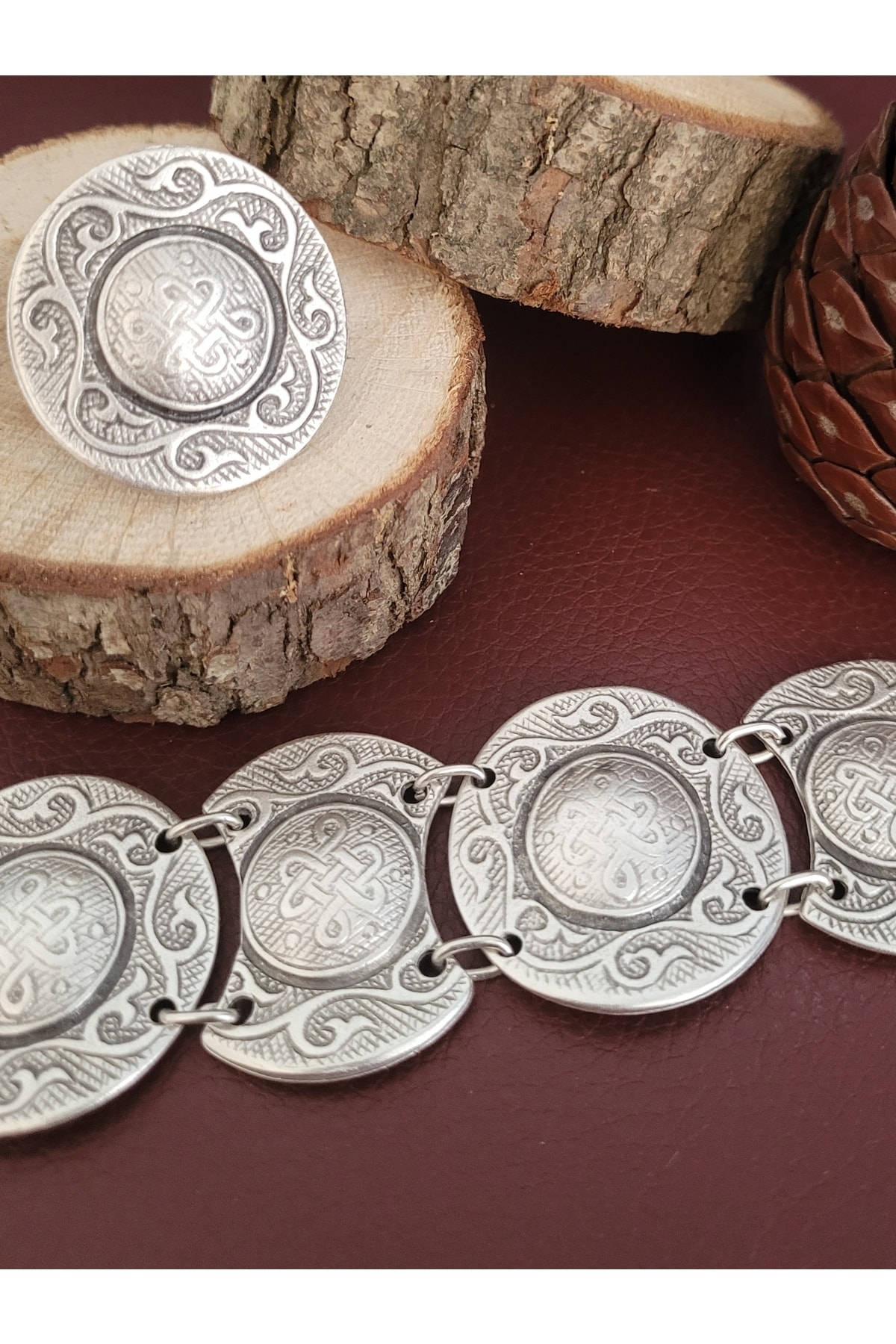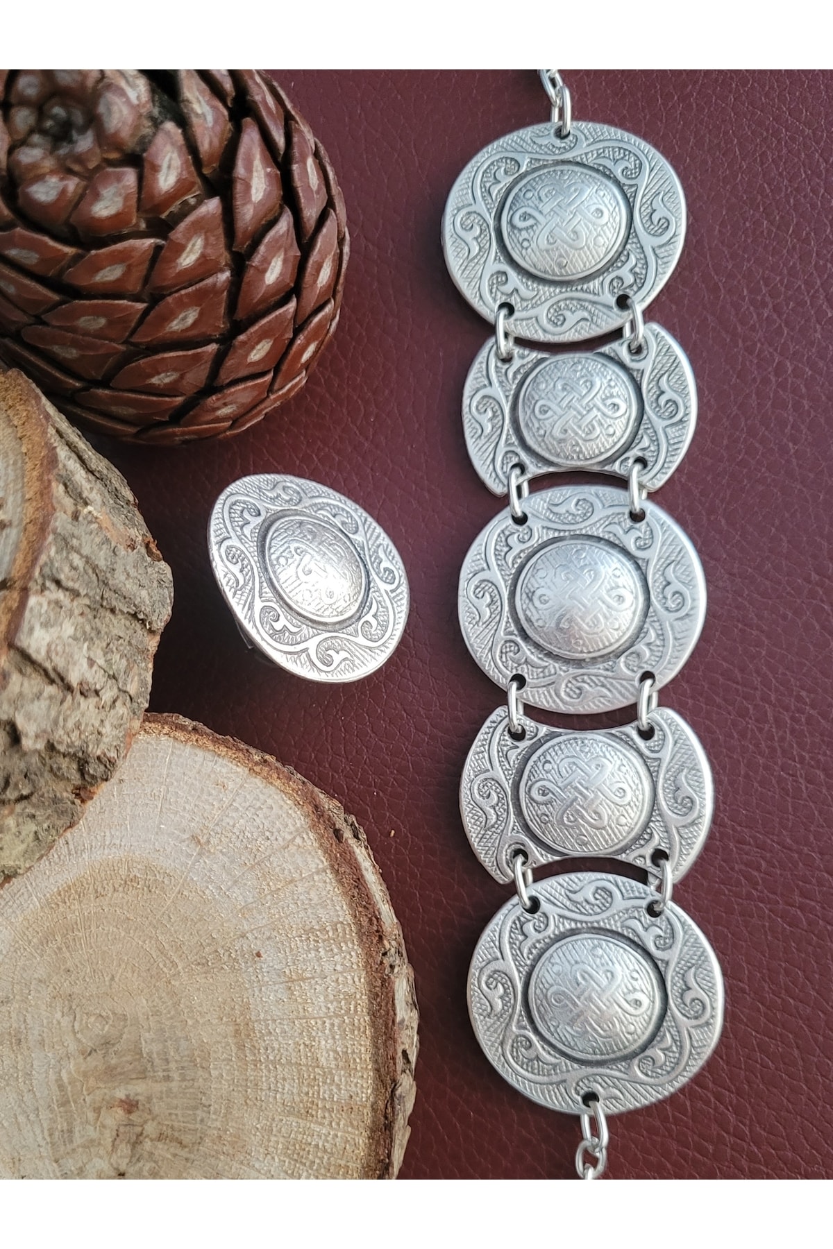 Selcuklu Sahdamar Motifli İslemeli Bileklik ve Yuzuk Set, Gumus Kaplama Bileklik & Yuzuk Set