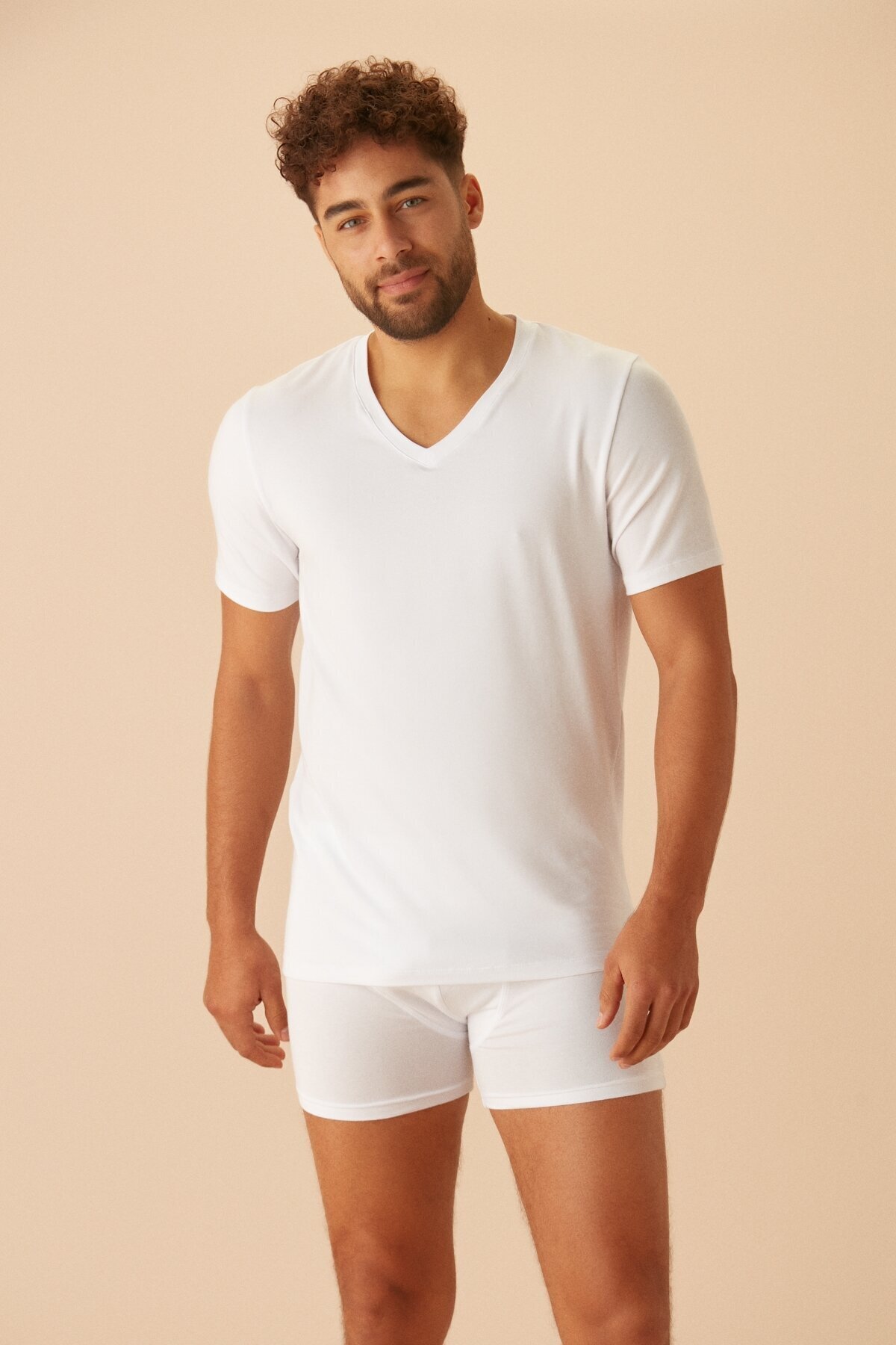 Beyaz Beyaz renk V yakalı tişört, çok yönlü kullanım sağlayan yalın tasarımı sayesinde dinamik ve cool görünmek isteyen erkeklerin favori parçası oluyor