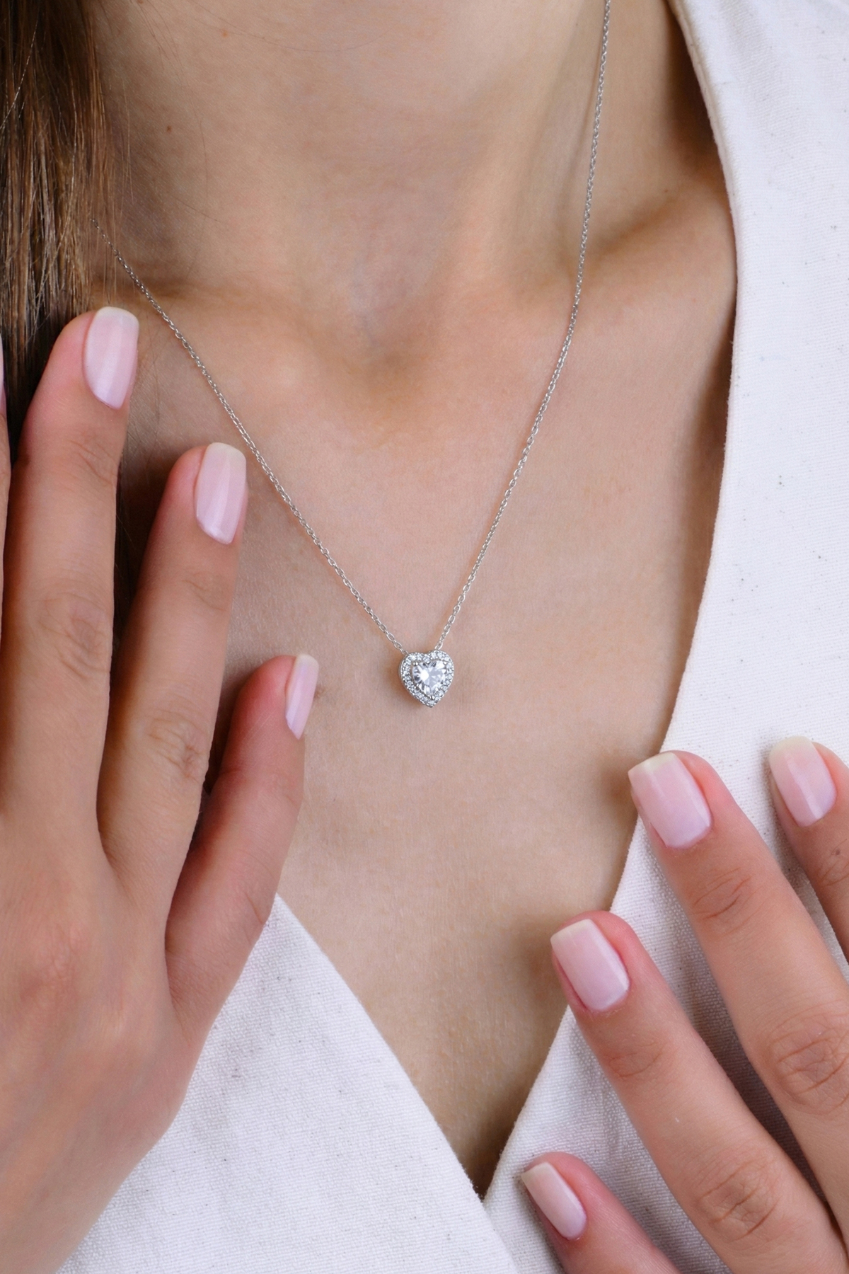925 ayar gümüş rodyumlu zirkon taşlı pırlanta montürlü kalp modeli kolye .