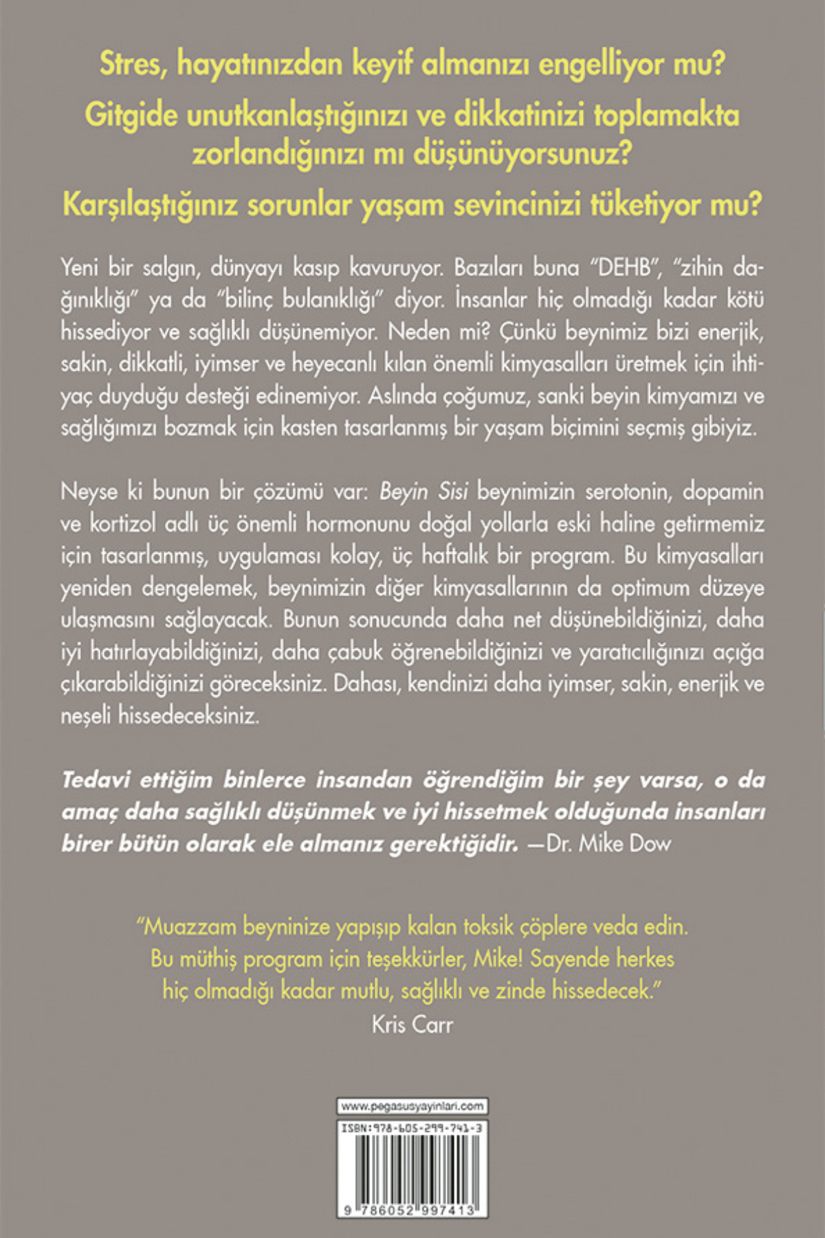 Neyse ki bunun bir çözümü var: Beyin Sisi beynimizin serotonin, dopamin ve kortizol adlı üç önemli hormonunu doğal yollarla eski haline getirmemiz için tasarlanmış, uygulaması kolay, üç haftalık bir program. Bu kimyasalları yeniden dengelemek, beynimizin diğer kimyasallarının da optimum düzeye ulaşmasını sağlayacak. Bunun sonucunda daha net düşünebildiğinizi, daha iyi hatırlayabildiğinizi, daha çabuk öğrenebildiğinizi ve yaratıcılığınızı açığa çıkarabildiğinizi göreceksiniz. Dahası, kendinizi daha iyimser, sakin, enerjik ve neşeli hissedeceksiniz.