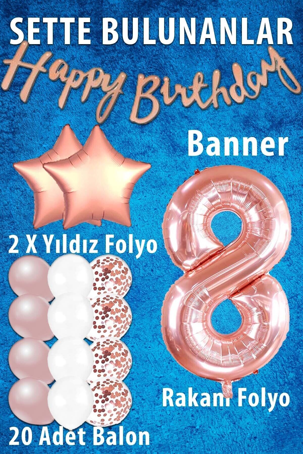 Rose Gold Konsept 8 Yaş Doğum Günü Parti Kutlama Seti