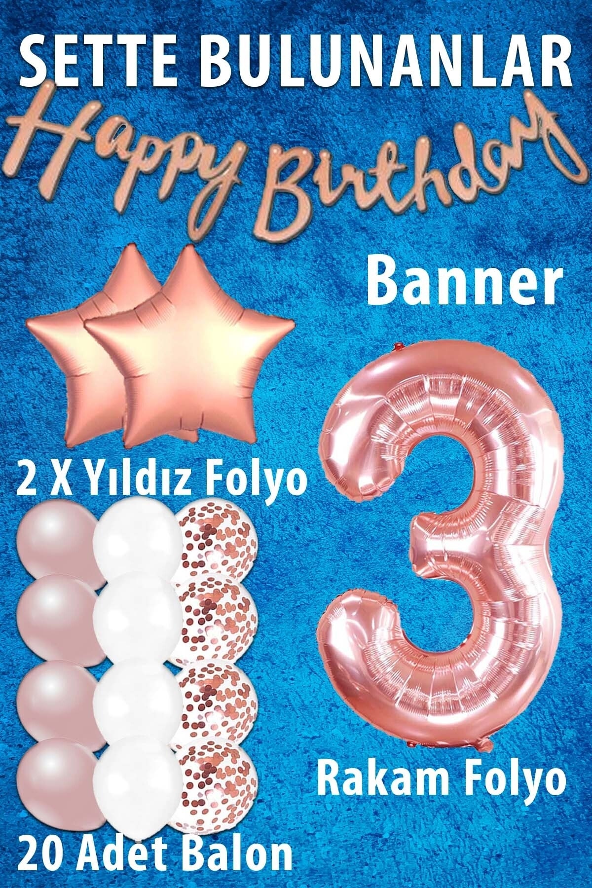 Beyaz Rose Gold ve Konfetili Balon, Rakam ve Yıldız Folyo Balon ve Kaligrafi Happy Birthday Rose Gold Banner Parti konsepti arayanlar için en özel setler Patladı Gitti'de. Gold konseptli parti yapmak isteyenler bu seti çok beğenecek. Paket İçeriği: Görselde yer alan ROSE Gold renkli 32"-34" Inc 82 cm rakam folyo balon. (1 adet) Yıldız rose gold folyo balon. (2 adet) Ebat: 18 inç / 45 cm Happy Birthday yazılı kaligrafi rose gold banner. (1 adet) 12 inch beyaz rose gold ve konfetili karışık balon. (20 Adet)