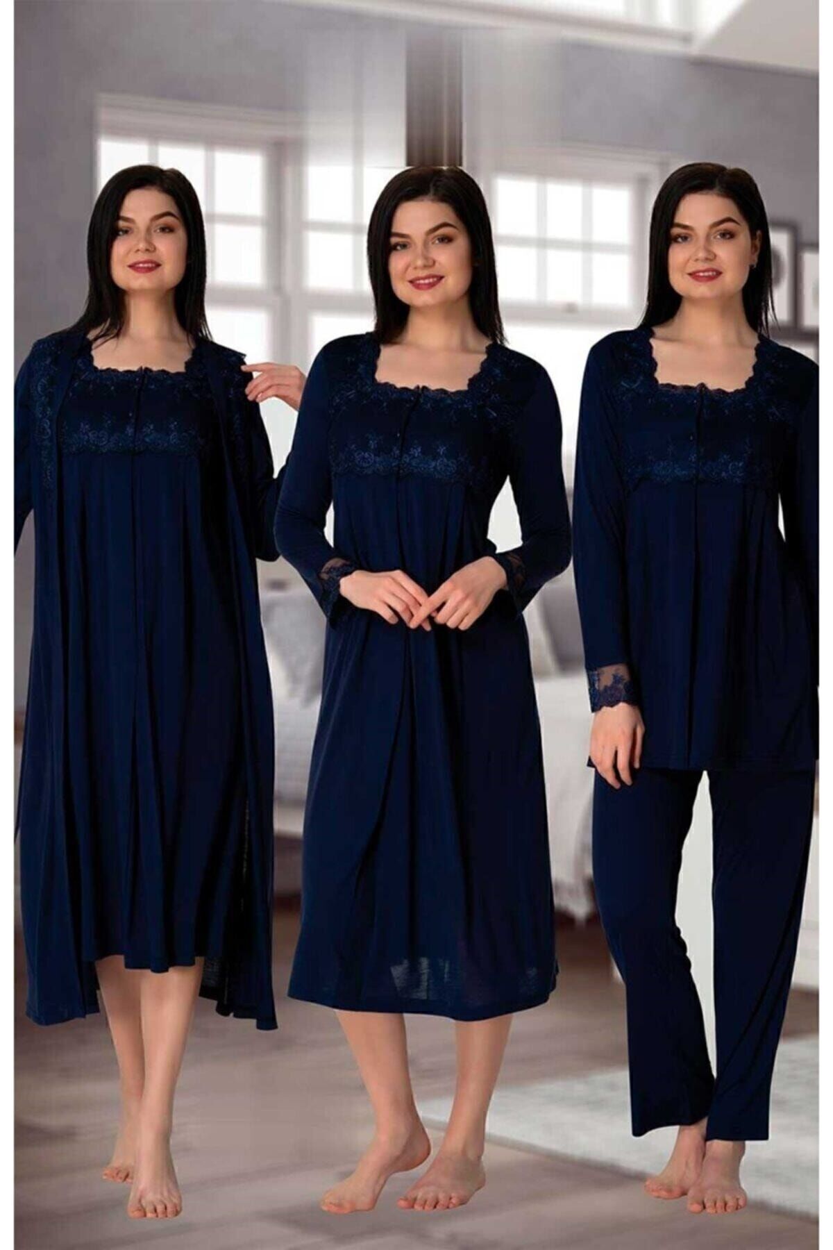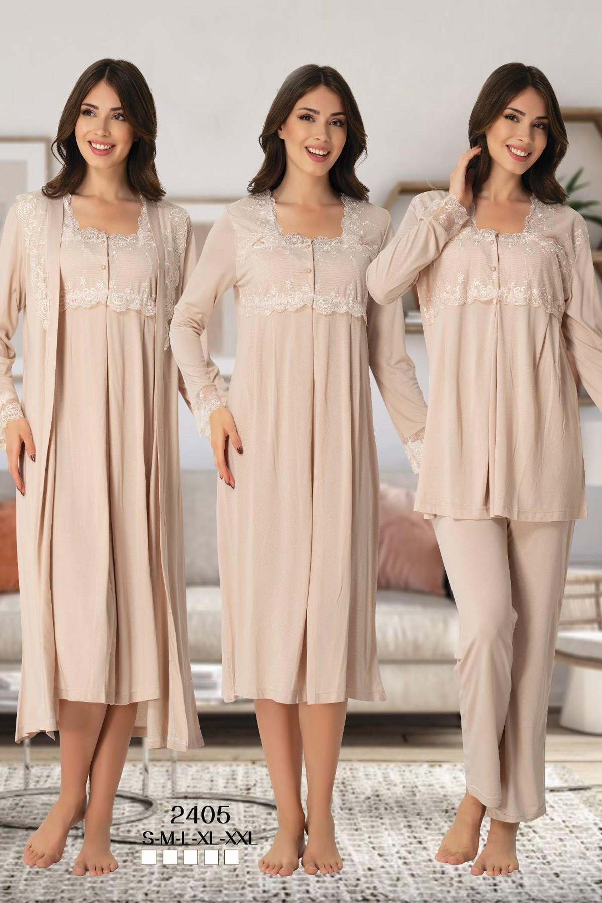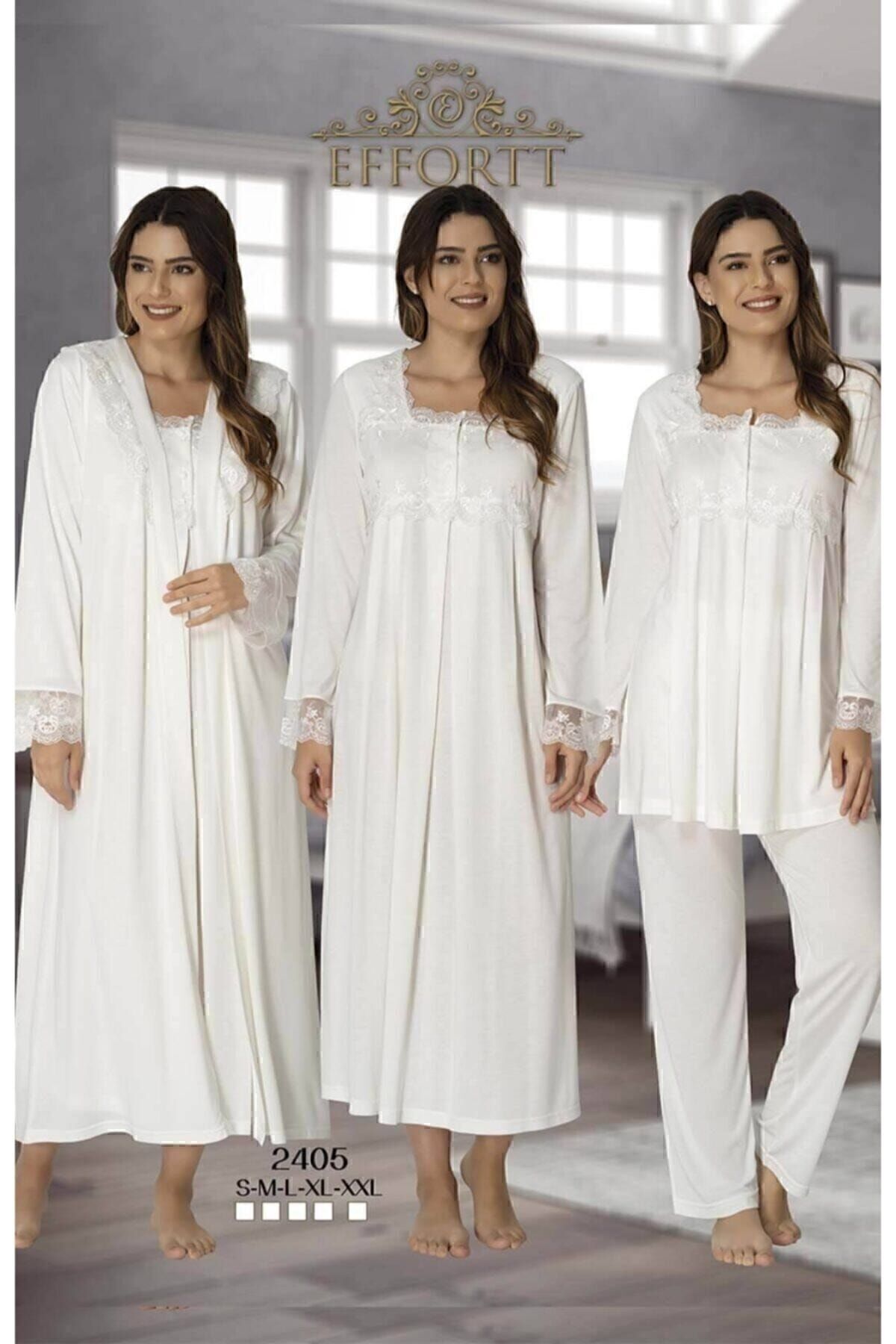 Effort Kadın Ekru Uzun Kollu Pijama Takımı Gecelik Sabahlık Lohusa Hamile 4'lü Set 2405