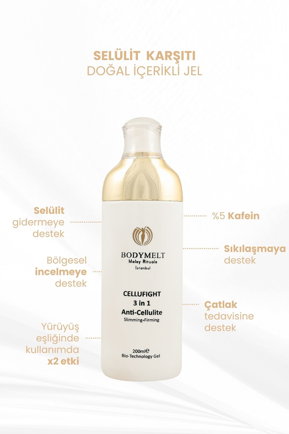 " Sıkılaştırıcı Bölgesel İncelme Selülit ve Çatlak Karşıtı Jel, cildinizi sıkılaştırarak pürüzsüz ve sağlıklı bir görünüme kavuşturur. Özenle seçilmiş bileşenleriyle selülit ve çatlak görünümünü azaltmaya yardımcı olur. Bu etkili jel, içeriğindeki kafeinve diğer doğal ekstraktlar sayesinde cildinizi canlandırır ve selülitlerin görünümünü azaltır. Düzenli kullanımda cildinizde gözle görülür bir fark yaratır. Kullanım Talimatı:Temizlenmiş cilde yeterli miktarda jeli uygulayın ve dairesel hareketlerle masaj yaparak yedirin. Sabah ve akşam olmak üzere günde iki kez kullanılması önerilir. Ürün İçeriği: Kafein:Cildi canlandırır, kan dolaşımını artırır ve selülit görünümünü azaltır.