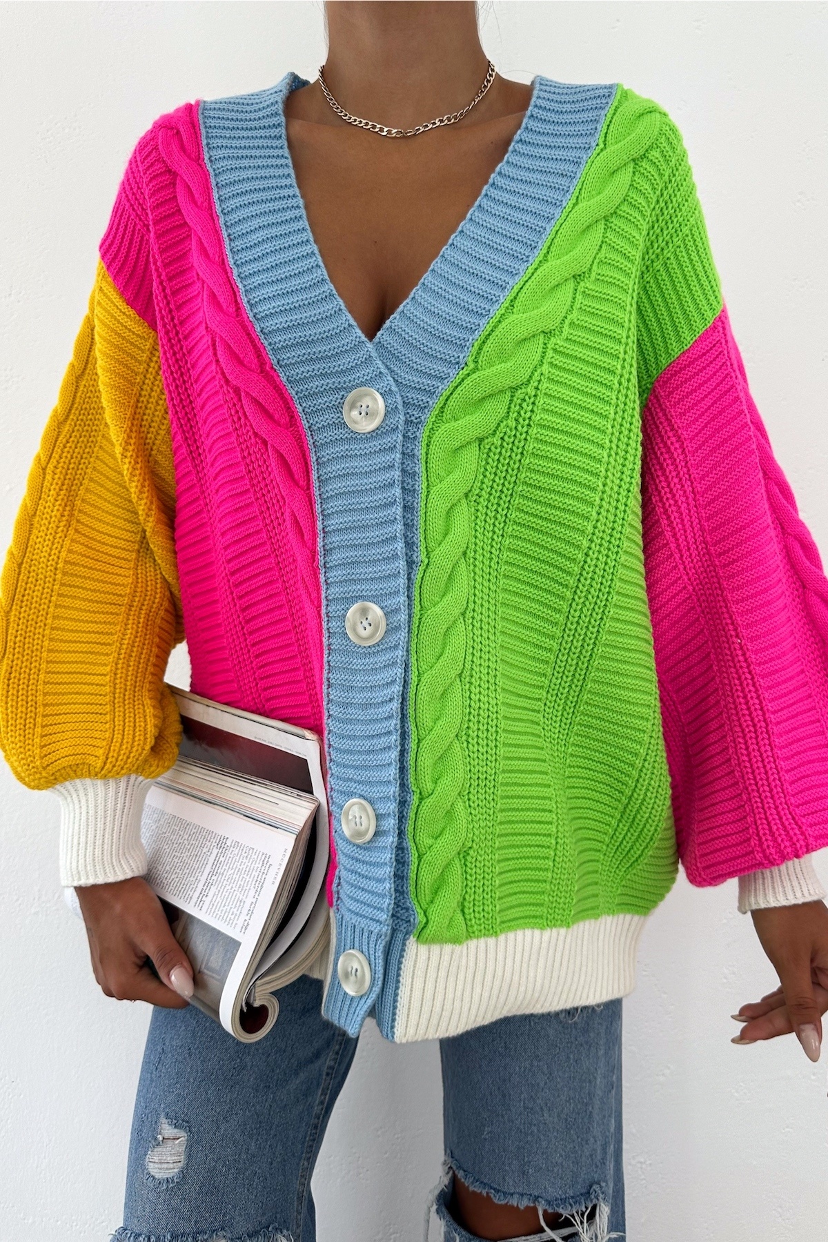 Triko Hırka Oversize Renkli Salaş Blok Desenli