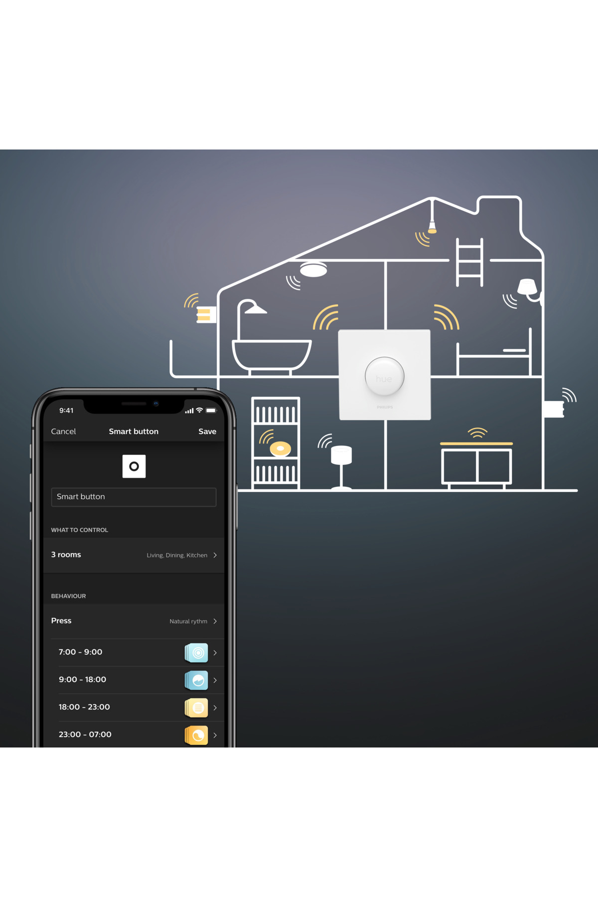 Philips Hue Smart Button akıllı uzaktan kumanda bağlı, karartıcı Ürün hakkında Işık yoğunluğunu ayarlamanızı, ışıklarınızı açıp kapatmanızı sağlayan bağlantılı ve kablosuz buton İkinci yapışkan desteği ile birden fazla montaj imkanı sunan kablosuz manyetik duvar tabanı