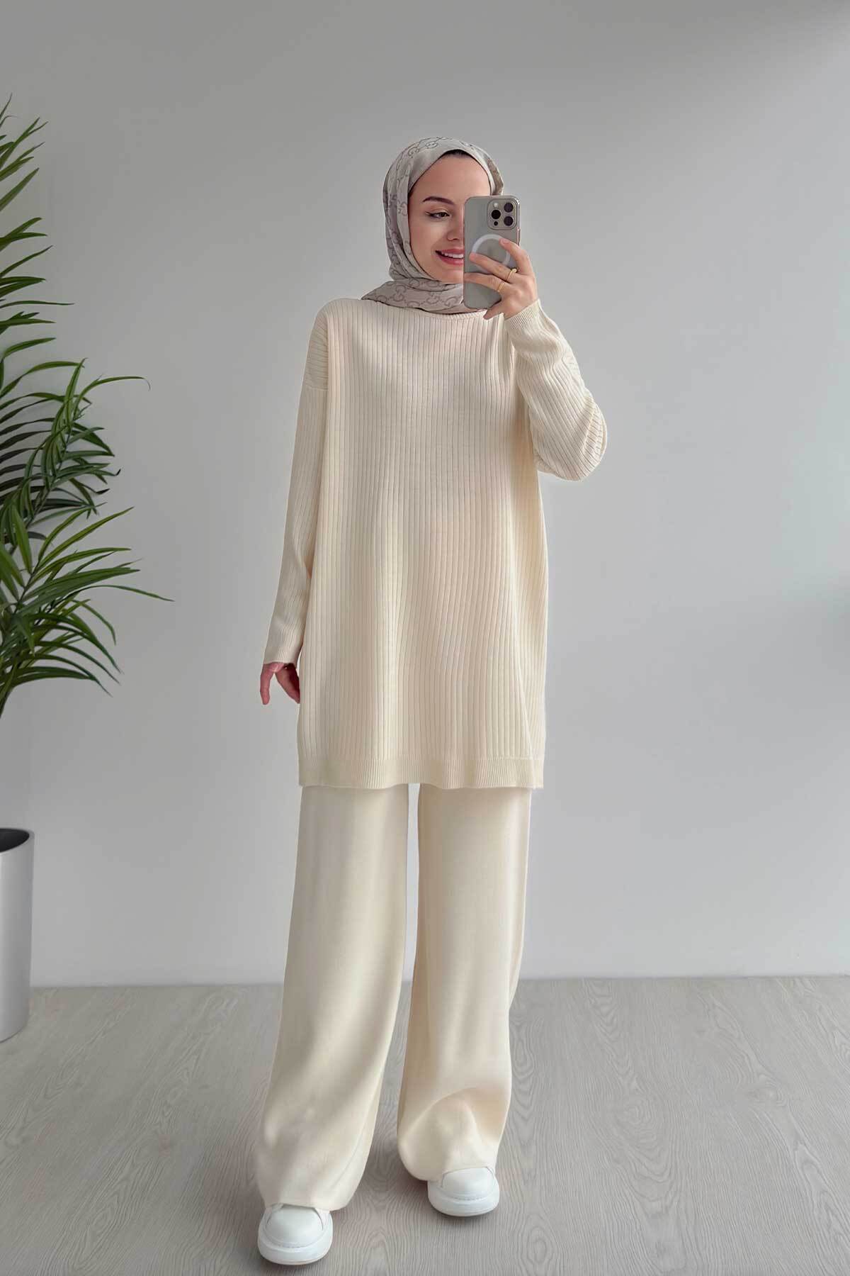 Standart Bedendir : 36-44 Uyumludur Ürün Özellikleri : Dik Yakalı, Yandan Yırtmaçlı Triko Tesettür Takım Tunik Yaka : Dik Yaka Tunik Uzunluk : 82 cm Göğüs Ölçüsü : 60 cm Kol Uzunluğu : 60 cm Pantolon Uzunluk : 101 cm Pantolon Bel : 35 cm - Esneklik ile birlikte 41 cm Pantolon Paça : 28 cm Pantolon Kalınlık : Kalın Tunik Kalınlık : Orta Ürün uzunlukları 1-3 cm arası değişkenlik gösterebilir Kumaş Türü : Triko Yıkama Talimatı Ürününüzü tercihen düşük ısıda (15/30) ters çevirerek yıkayabilir, kullanım ömrünü uzatabilirsiniz.