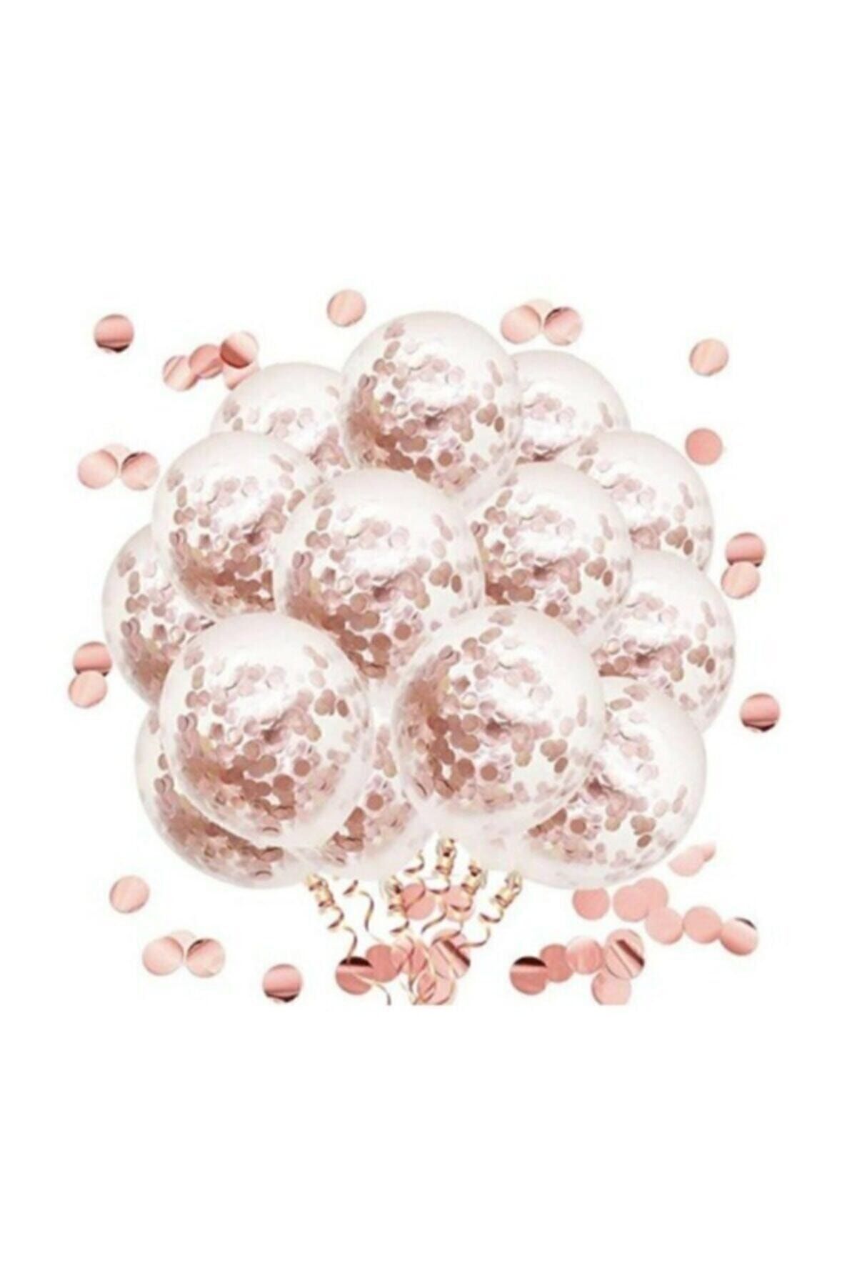 Pembe altın konfetiler, balonların üzerine zarif bir şekilde yerleştirilerek görsel bir şölen sunar