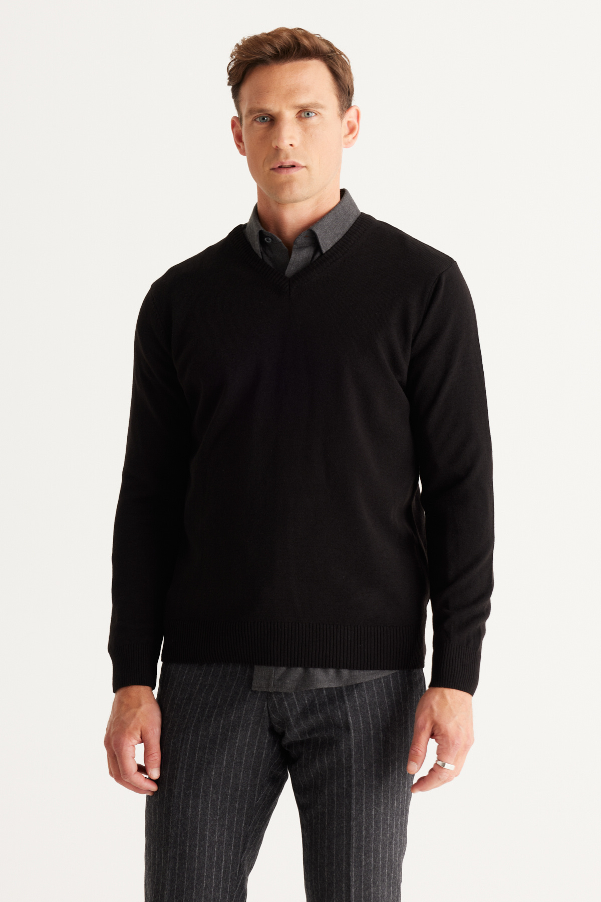 %100 Akrilik, Düz Siyah, Casual Model, Standart Fit, V Yaka, Uzun Kollu, Sıcak Tutan, Cepsiz, Kış Koleksiyonu, Altınyıldız Classics Standart Fit Normal Kesim V Yaka Triko, Ürün Bedeni: L, Manken Ölçüleri: Boy: 1.89cm, Kilo: 80kg, AC X Burak Özçivit Koleksiyonu, Ürün Kodu: 4A4923100002SYH.