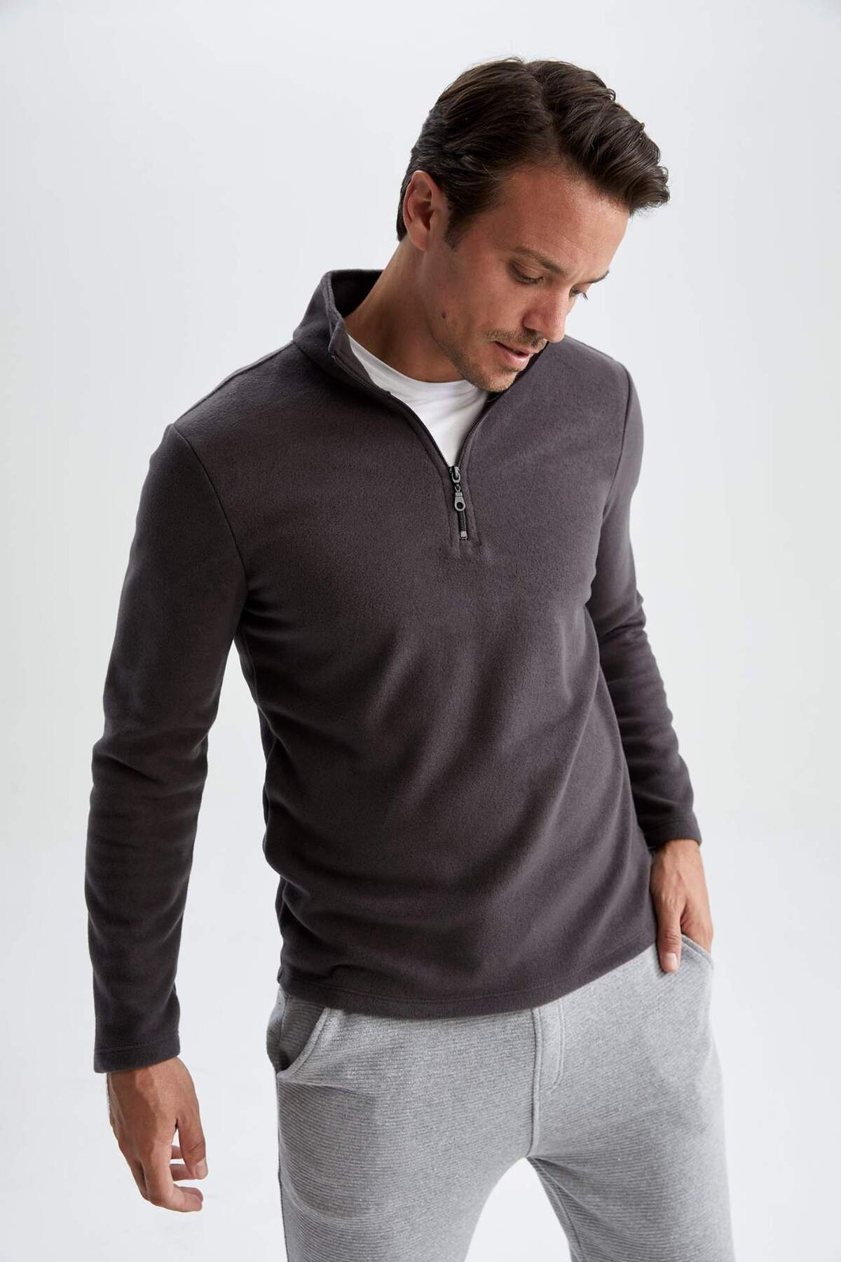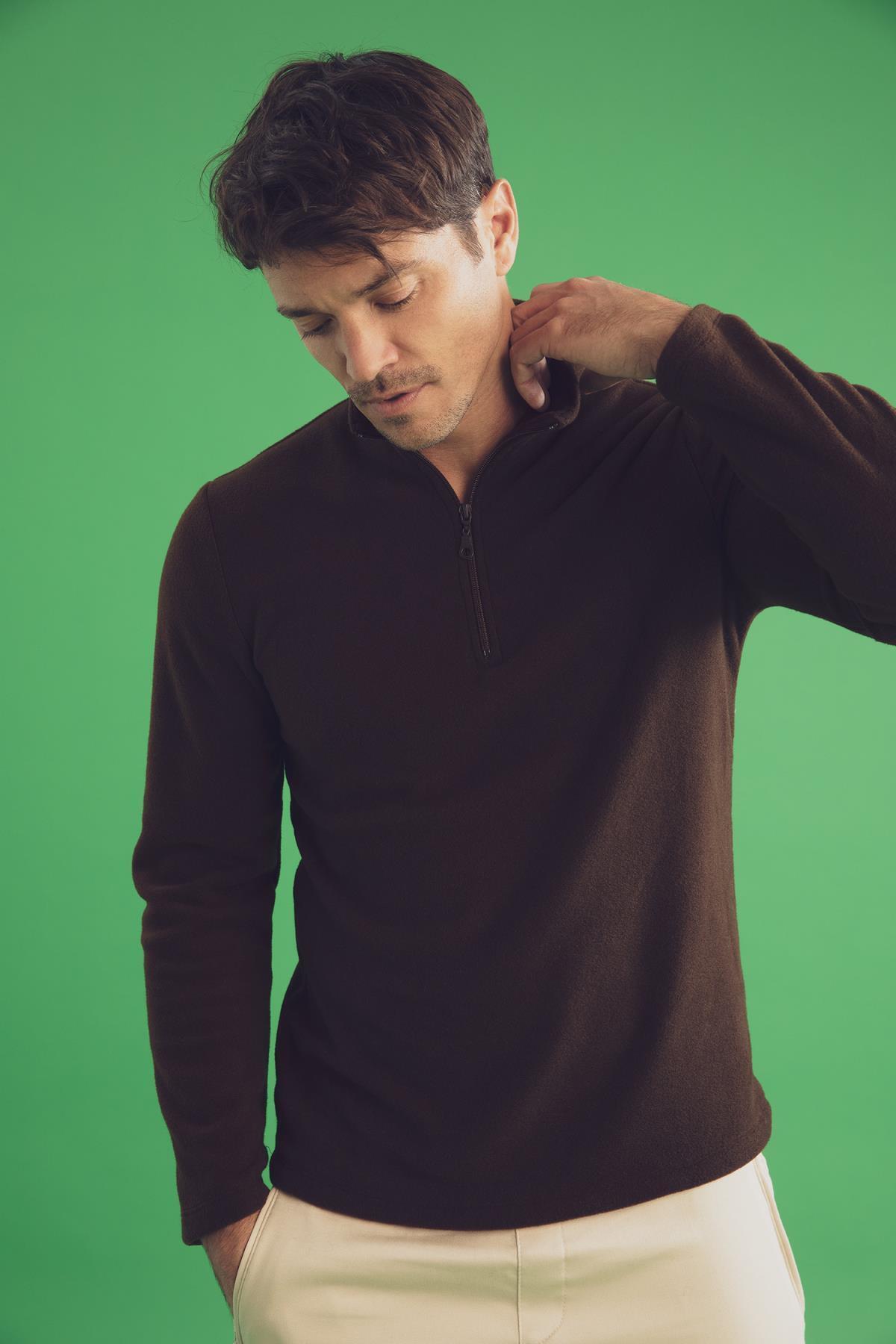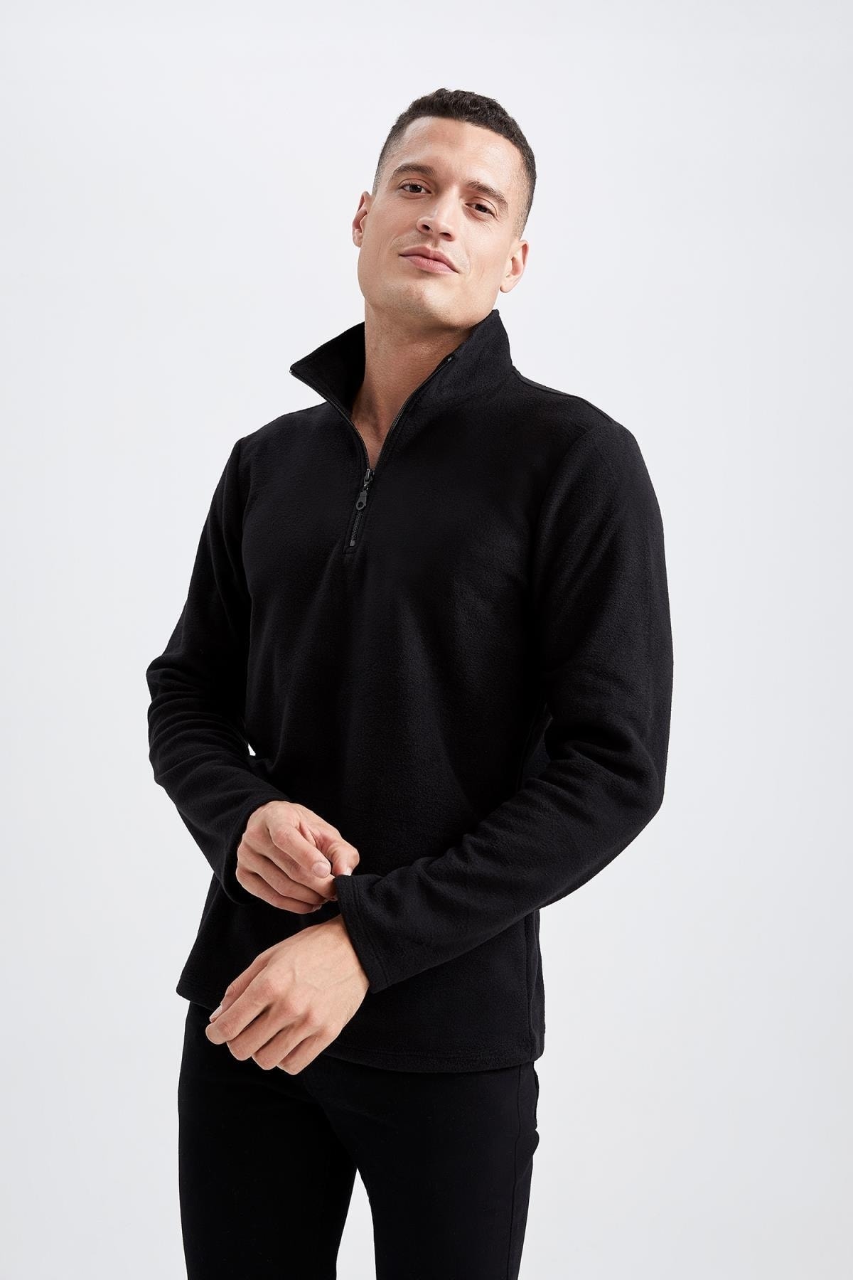 Konforlu kullanım sağlayan sweatshirt kumaşı, fermuarlı dik yaka, kol ve etek uçları esnek ribanalı, rahat ve spor tasarımı ile polar eşofmanlar, spor şortlar, bomber, biker, jean ceket ve jean pantolon gibi sokak modasına yön veren parçalarla kombinleyebileceğiniz DeFacto Erkek Regular Fit Fermuarlı Dik Yaka Sweatshirt.