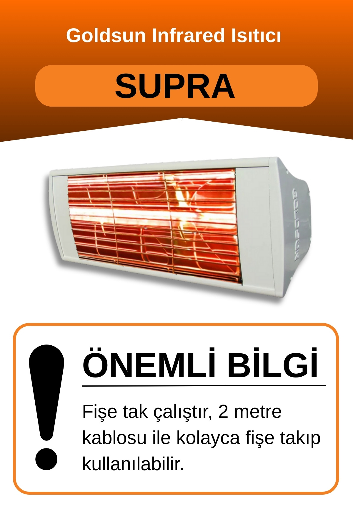 SUPRA serisinde bulunan dört ayrı kapasite sayesinde tüm hava koşullarına uygun ısıtma kapasitesi belirlenebilir, Goldsun Supra GSS20 2000W Su Korumalı Açık Alan Elektrikli Infrared Isıtıcı Özel Tasarım Reflektör Kısa dalga teknolojisinin son ürünü olan SUPRA, Devlet teşvikli 6 aylık AR&GE çalışmaları neticesinde geliştirilen özel reflektörü sayesinde ampulden çıkan ışınların tümünü cisimlere yansıtarak ısıtma verimini %28 arttırır