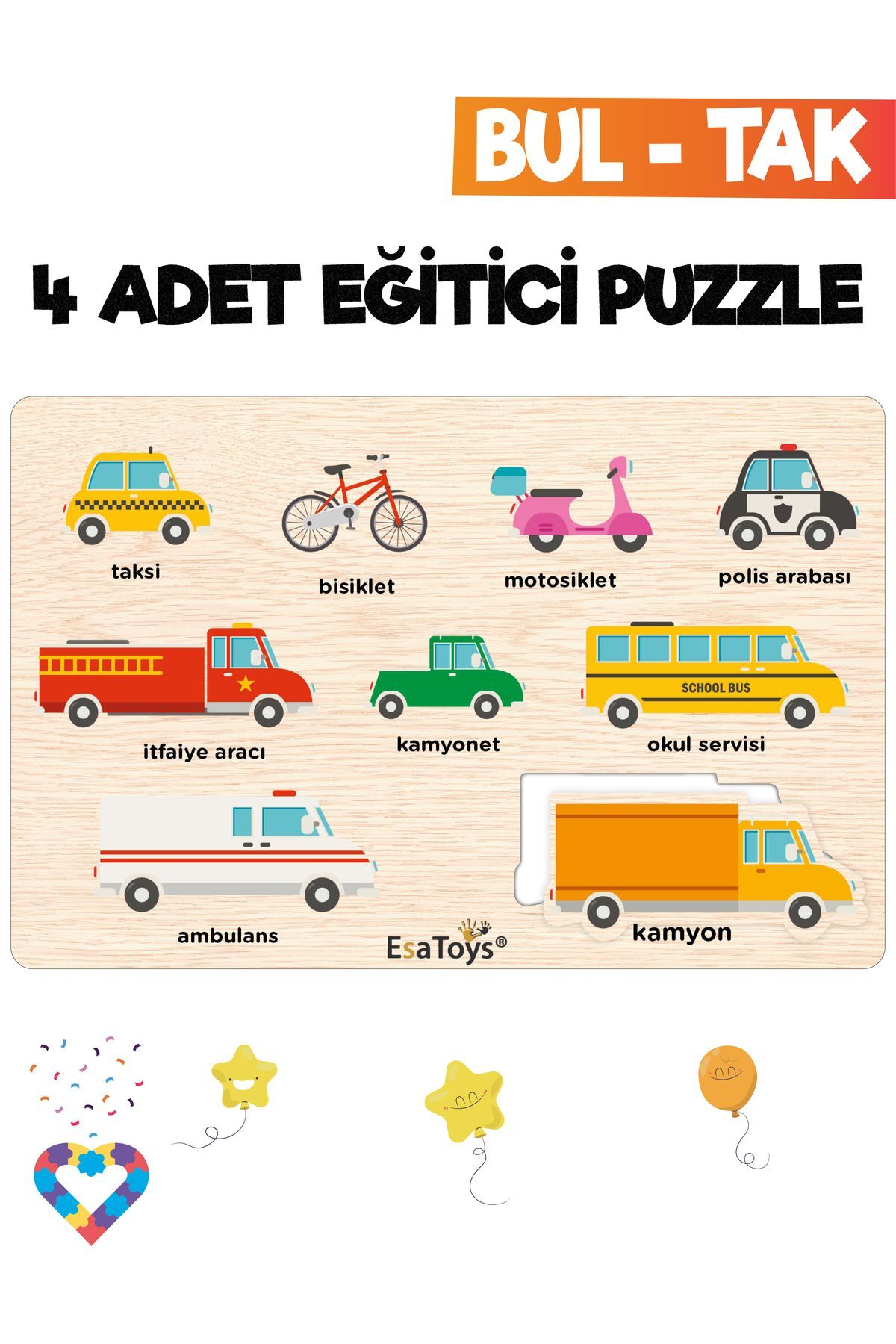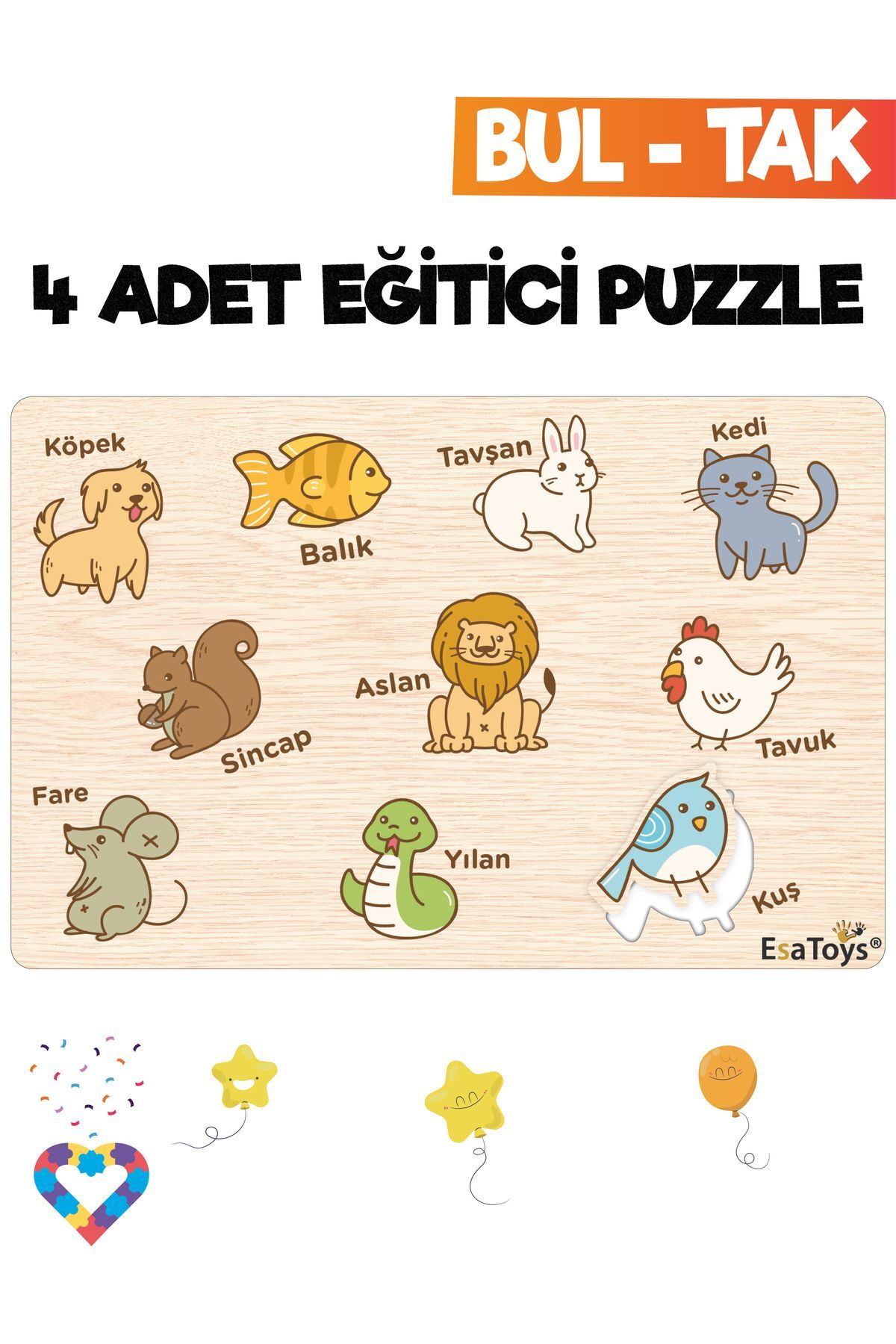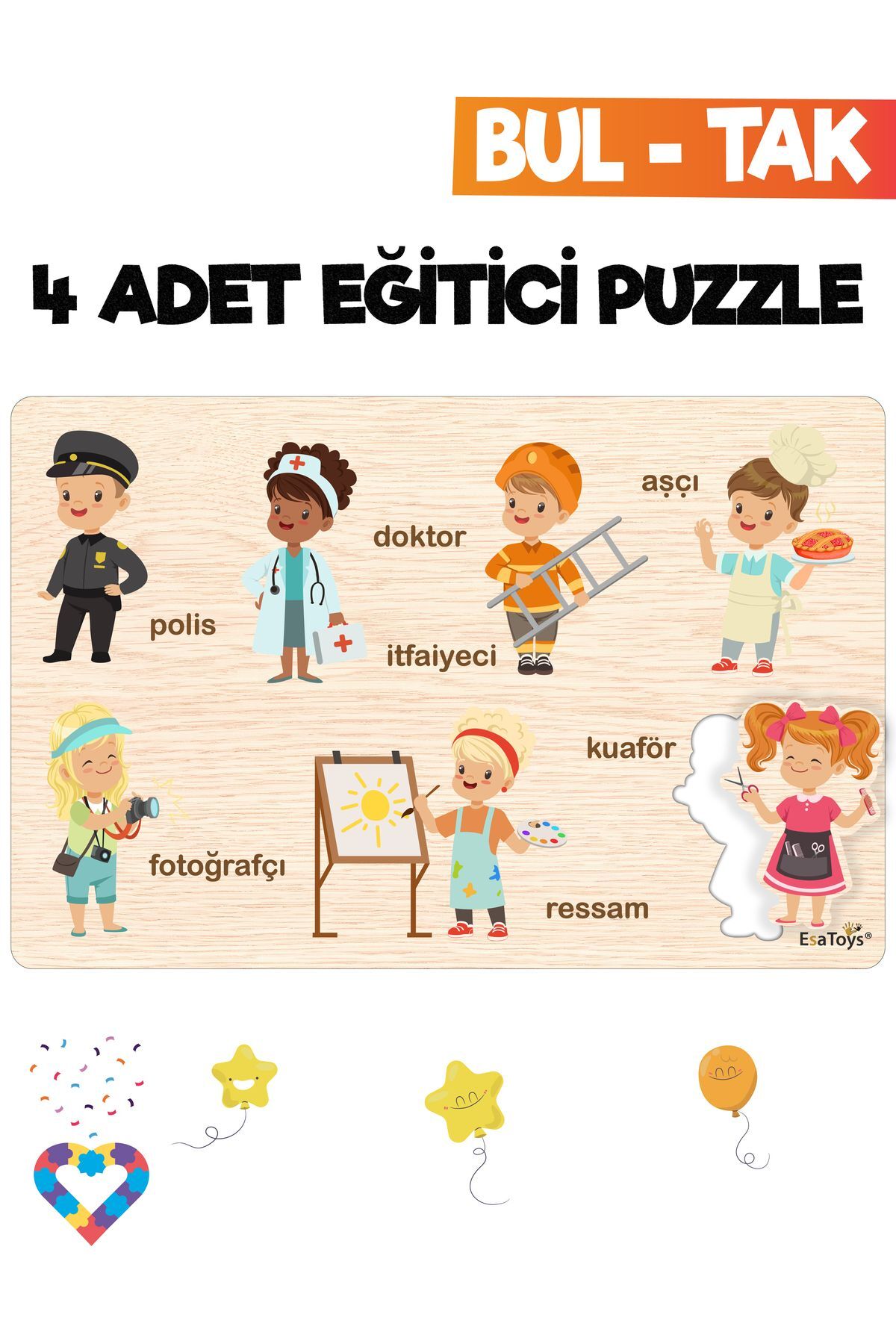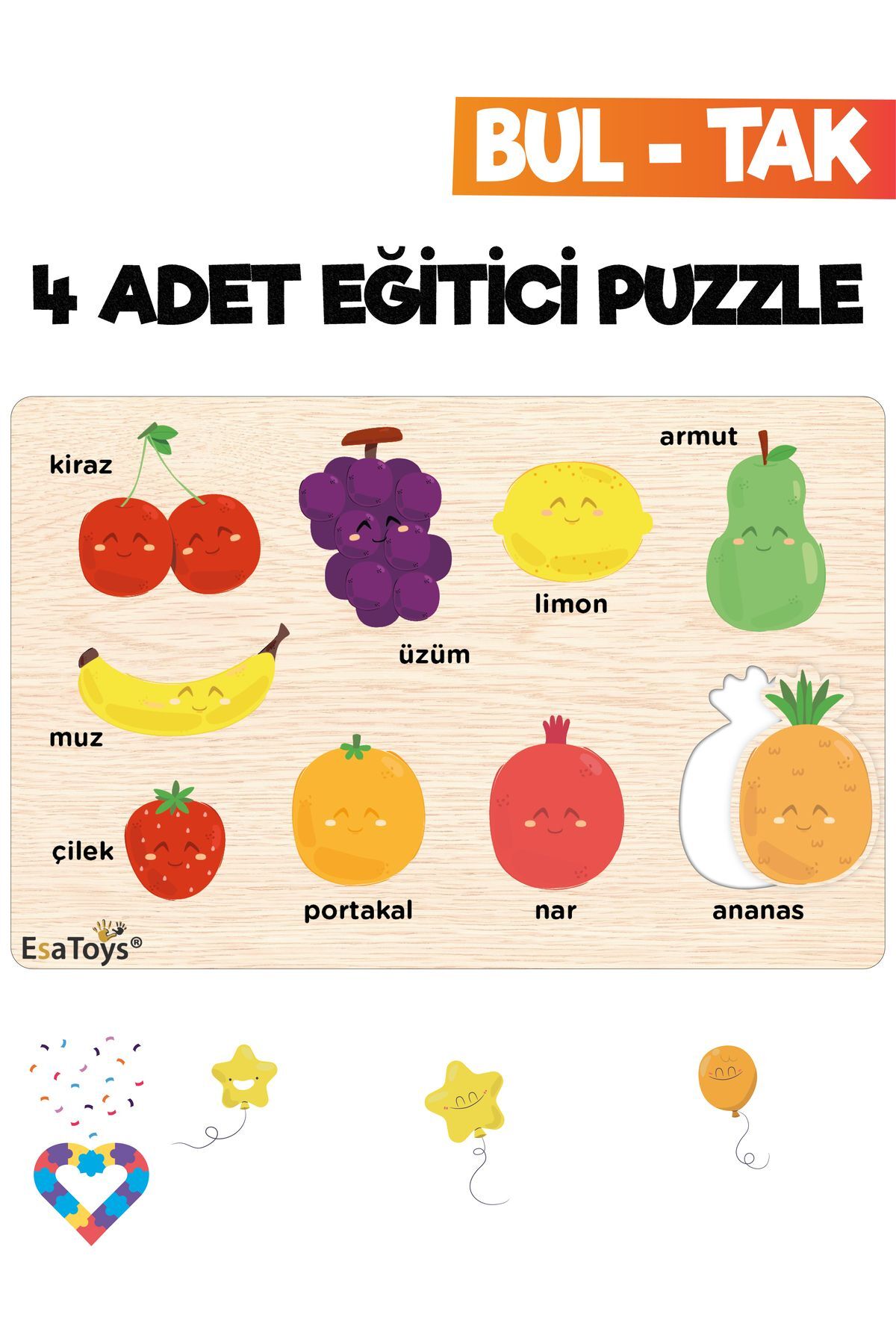 Ahşap Türkçe Meslekler Eğitici Yapboz Ahşap Türkçe Taşıtlar Eğitici Yapboz Ahşap Türkçe Hayvanlar Eğitici Yapboz Ahşap Türkçe Meyveler Eğitici Yapboz Miniklerimizin ilgilerini çekecek canlı renkler kullanılmıştır.