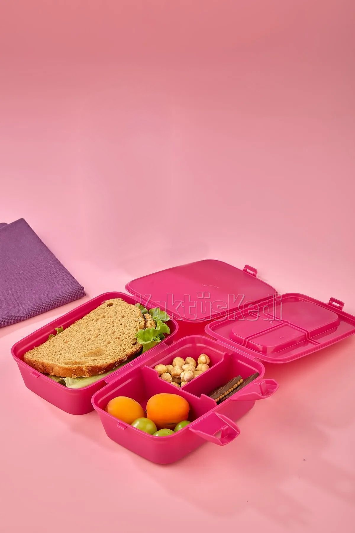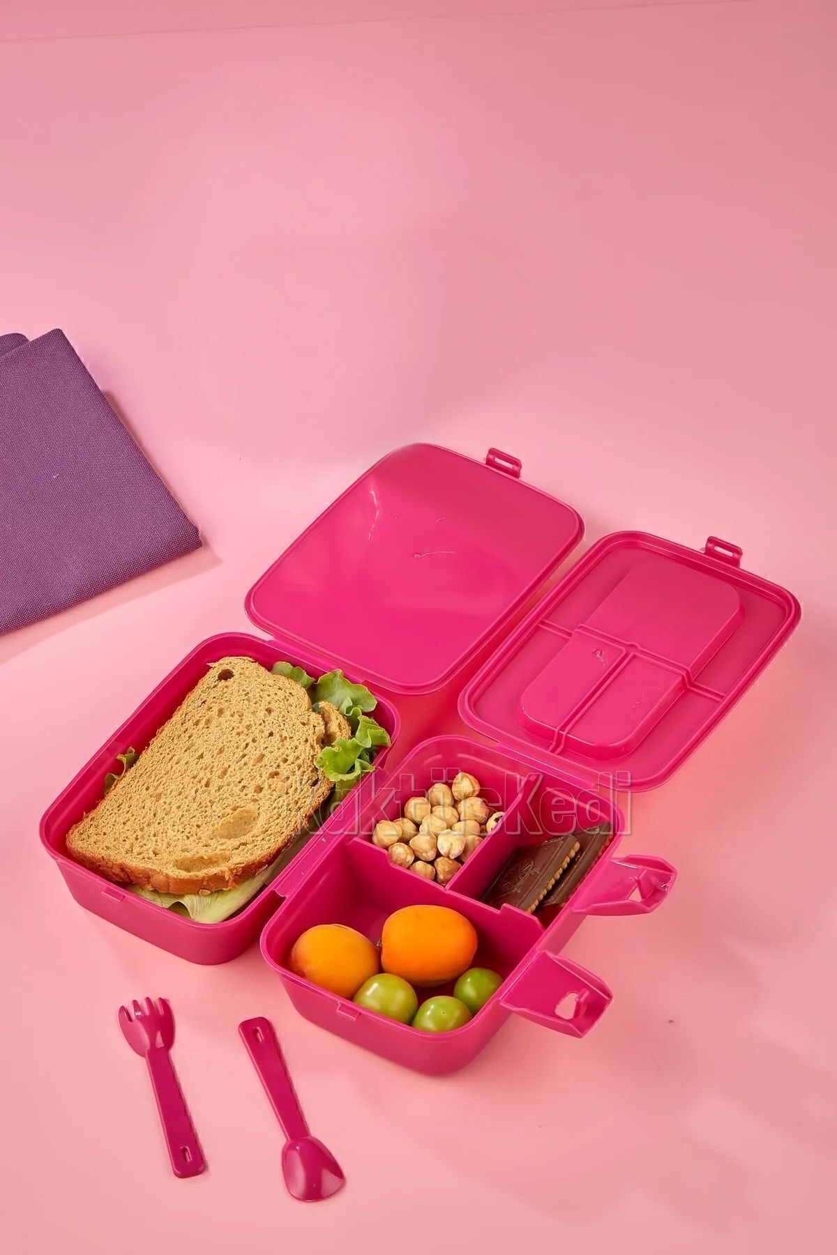 4 bölmesi sayesinde yemekler birbirine karışmaz. Ön kısmında kilitli mekanizması bulunur,bu sayede açılma yapmaz ve yiyecekler dökülmez.