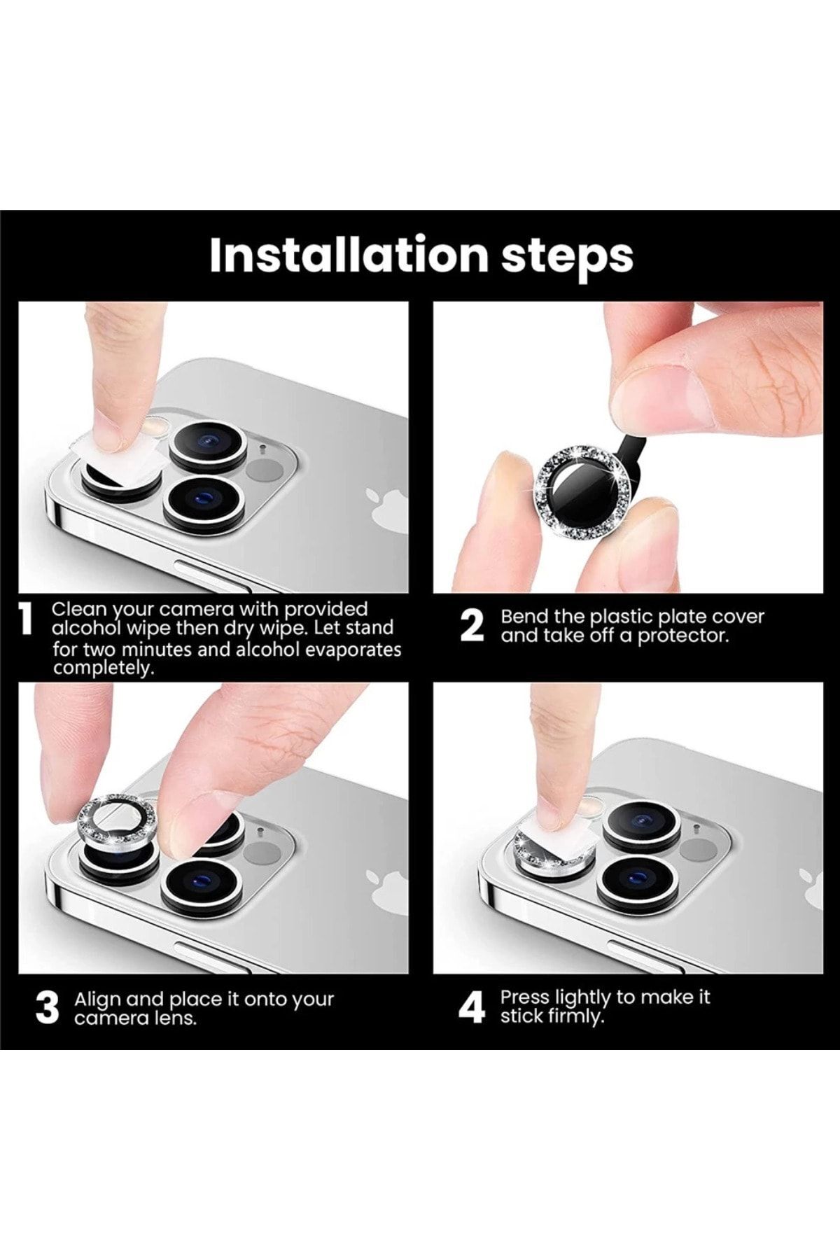 Apple iPhone 14 Pro Max ve 14 Pro modelleriyle tam uyumlu, cihazınızın kamera lensini çizilmelere ve darbelere karşı koruyan gümüş taşlı kamera lens koruyucu