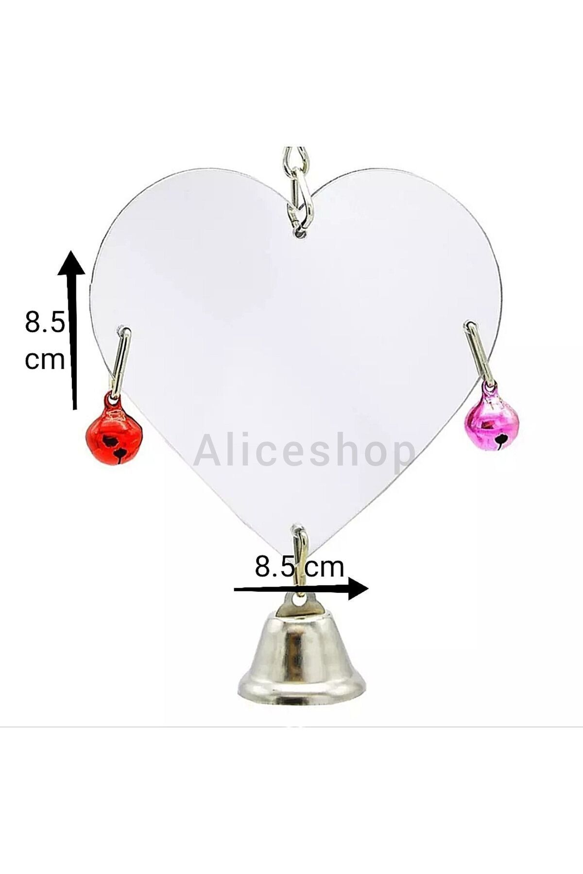 Kalp şeklinde Akrilik zilli kafes aynası muhabbet ve boyutundaki küçük kafes kuşları için tasarlanmıştır muhteşem zilli eğlenceli oyuncak ve kafesinizde çok güzel dekoratif bir aksesuar Akrilik aynalar pürüzsüz dayanıklı ve kuşlara zarar vermeyecek şekilde üretilmiştir Boy:8