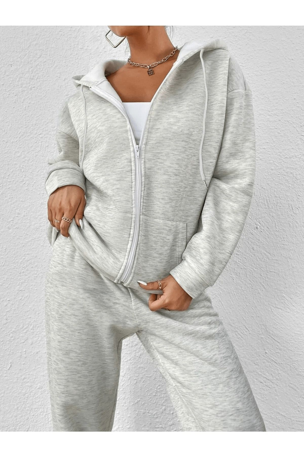BE QUEEN KAPÜŞONLU TAM FERMUARLI SOĞUK HAVAYA DAYANIKLI %100 PAMUK TAM KIŞLIK YENİ TREND GENİŞ SALAŞ OVERSİZE SOKAK STİLİ KADIN EŞOFMAN TAKIMI İÇİNDEKİ BEYAZ T