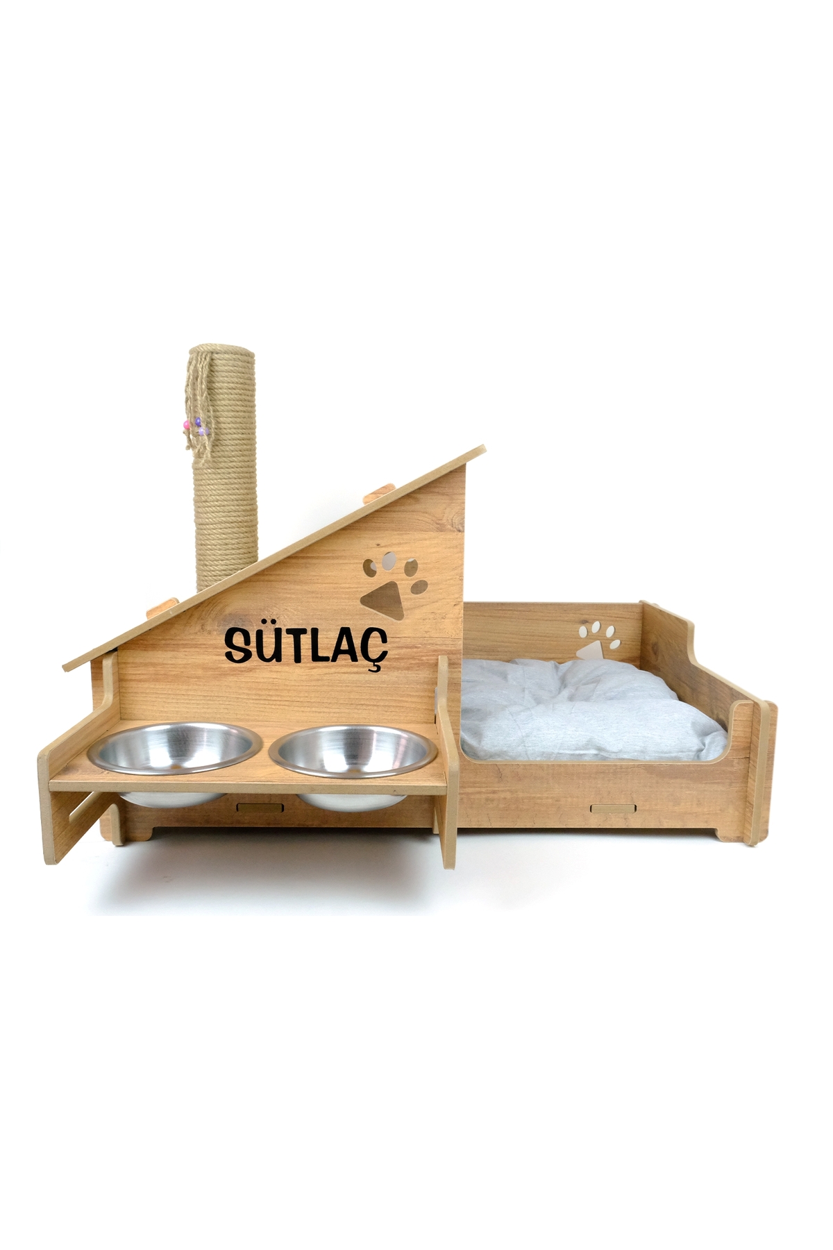 Ahşap Kedi & Köpek Su ve Mama Kabı - Kedi Evi - Tırmalama Çubuklu - Çelik Kase - 2*400ml