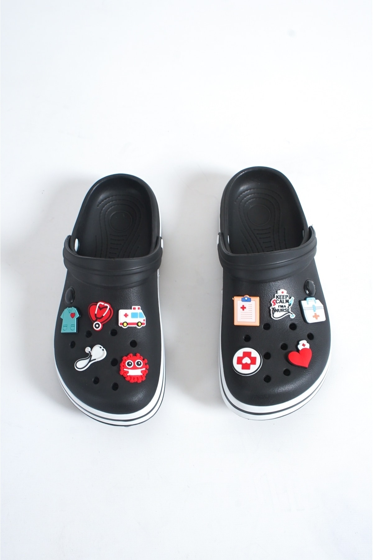 Figür desenli tasarımıyla şıklığı ve rahatlığı bir arada sunan siyah aksesuarlı düz clogs, günlük kullanım için idealdir