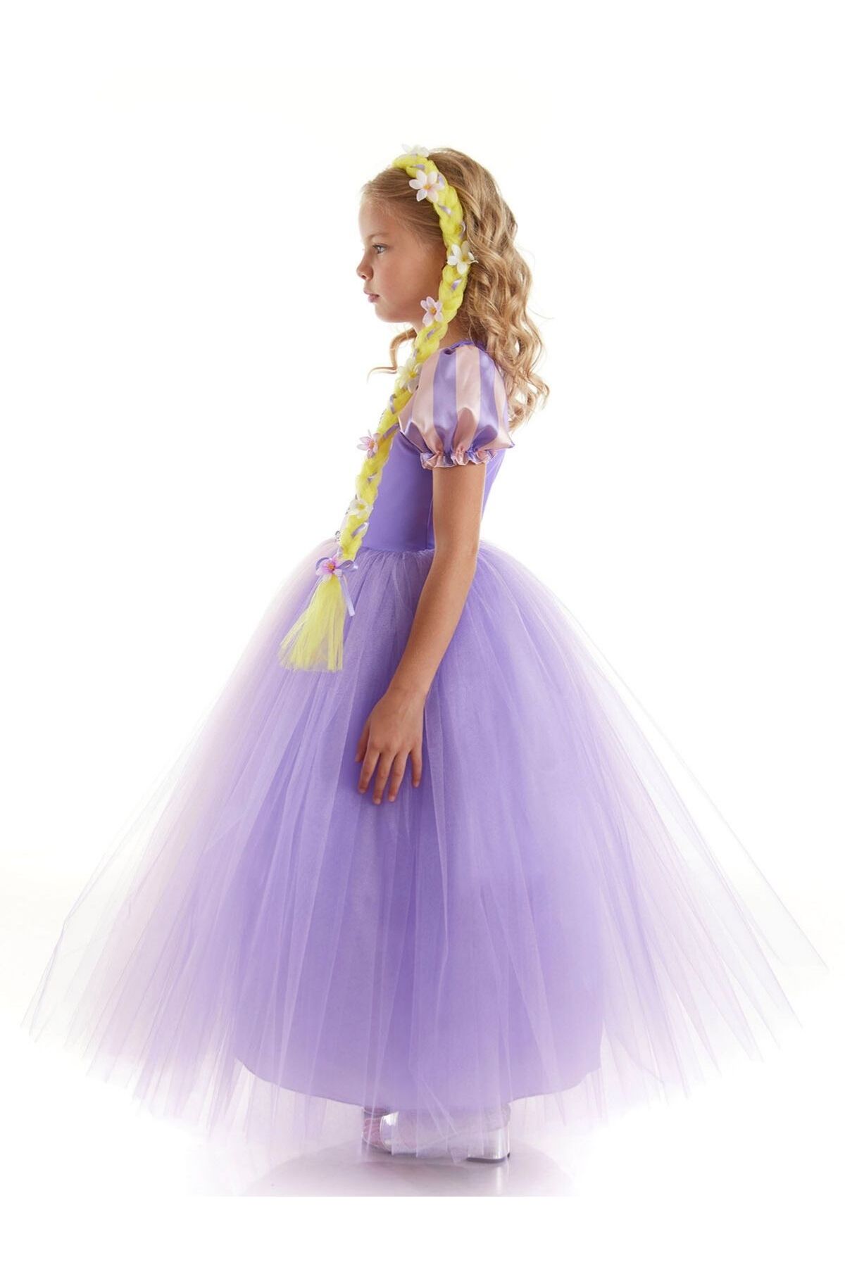 Pembe ve lila saten karpuz kollu Rapunzel elbisemizin üst bedeni kaliteli mayo kumaşından üretilmiş olup, ön tarafında gümüş renkli su taşı işlenmiştir.
