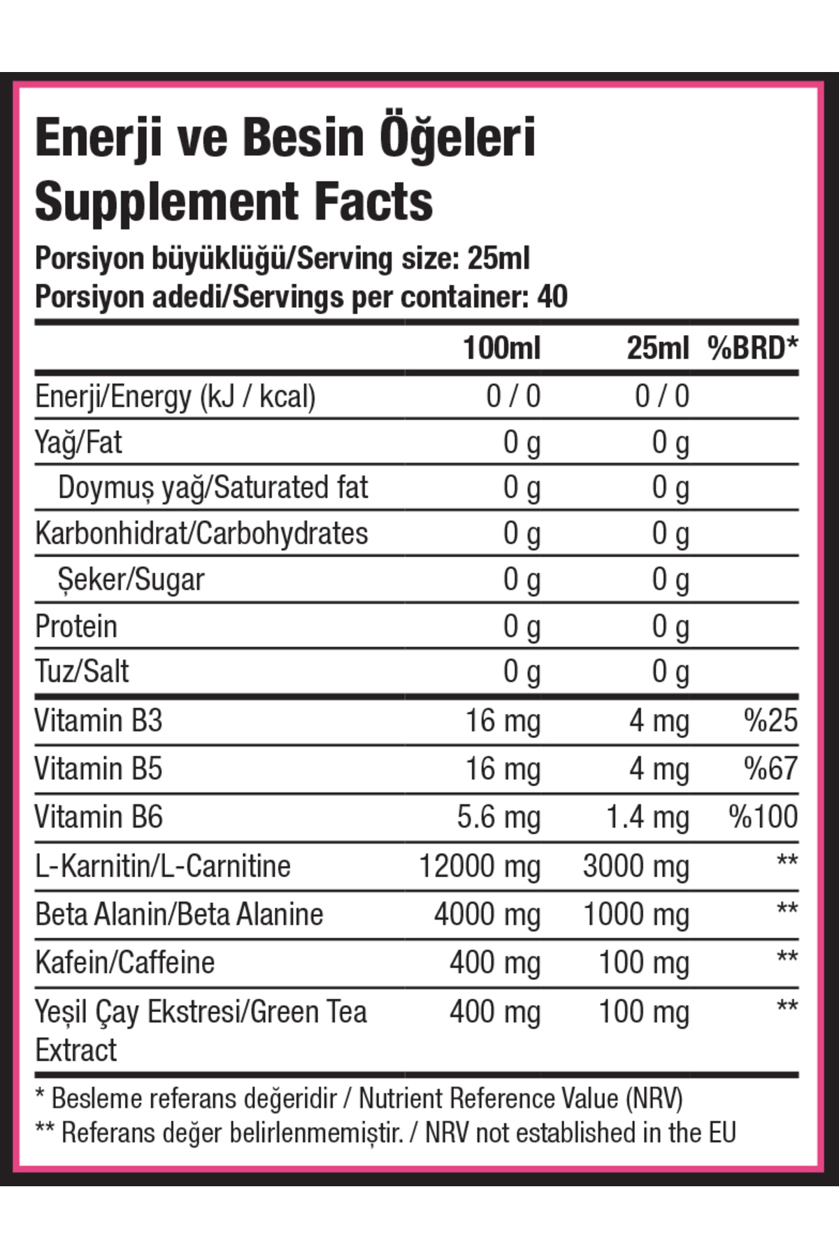 Xtreme Thermo l-Carnitine 3000 mg + Beta Alanine 1000 ml (yeşil elma) Her 1 ölçekte (25 ml)