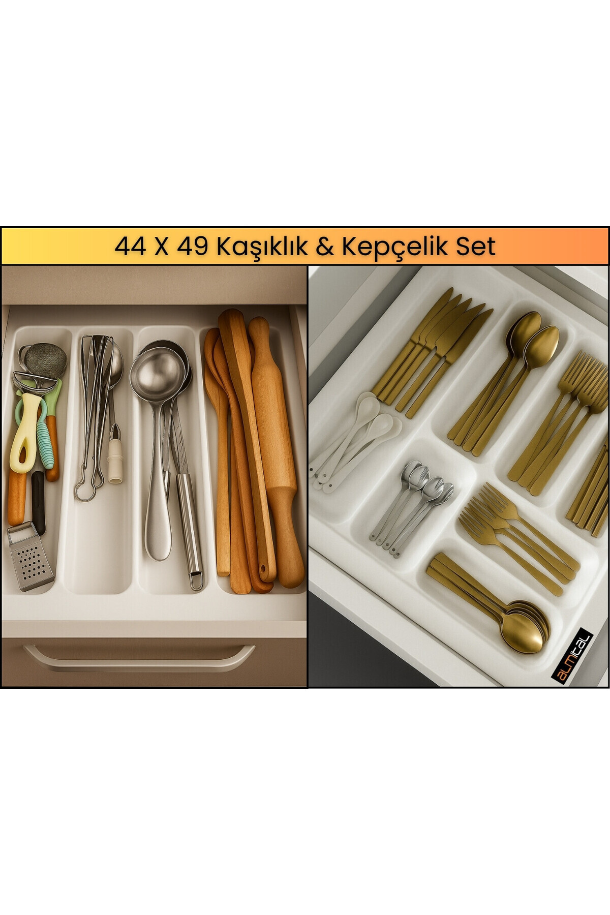- 44x49 cm boyutlarında, mutfakta ihtiyaç duyulan pratikliği sağlayan kaşıklık ve kepçelik seti.