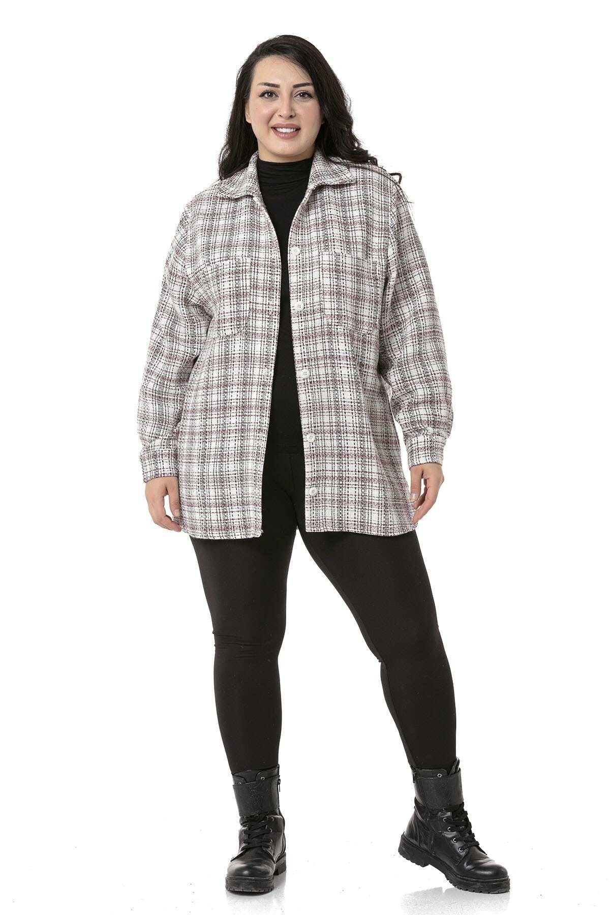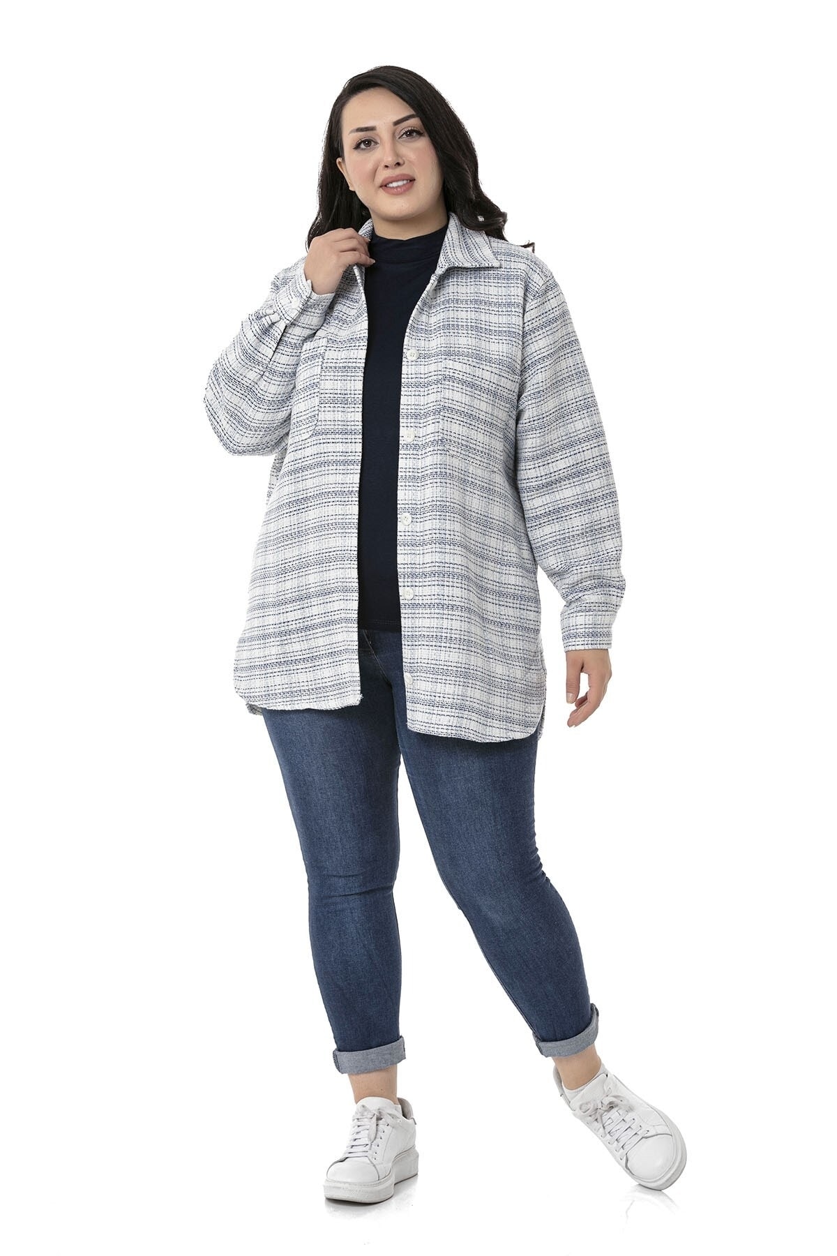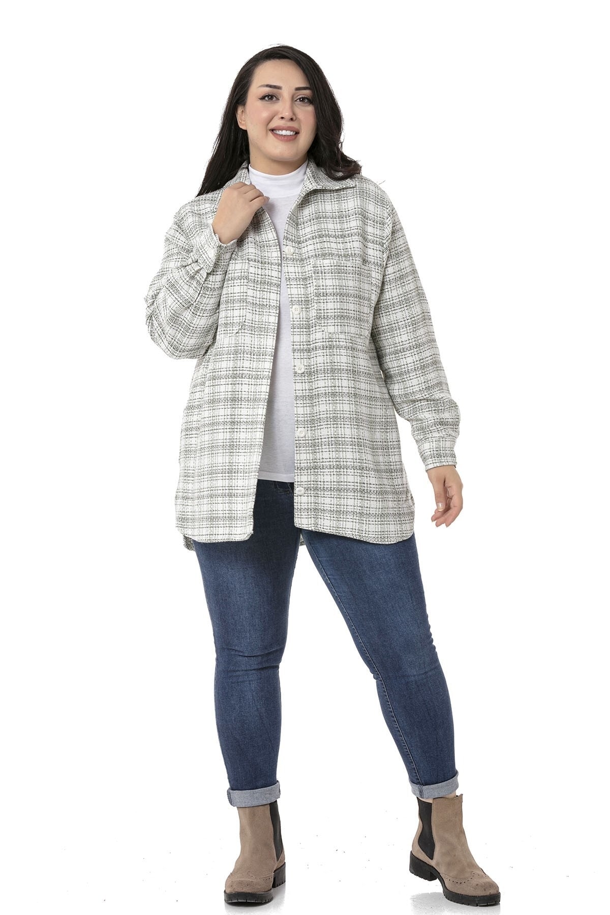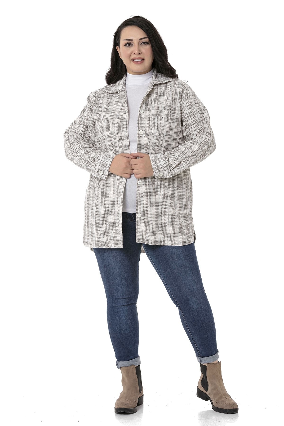 Büyük beden yanı yırtmaçlı ve cepli ceket gömlek.