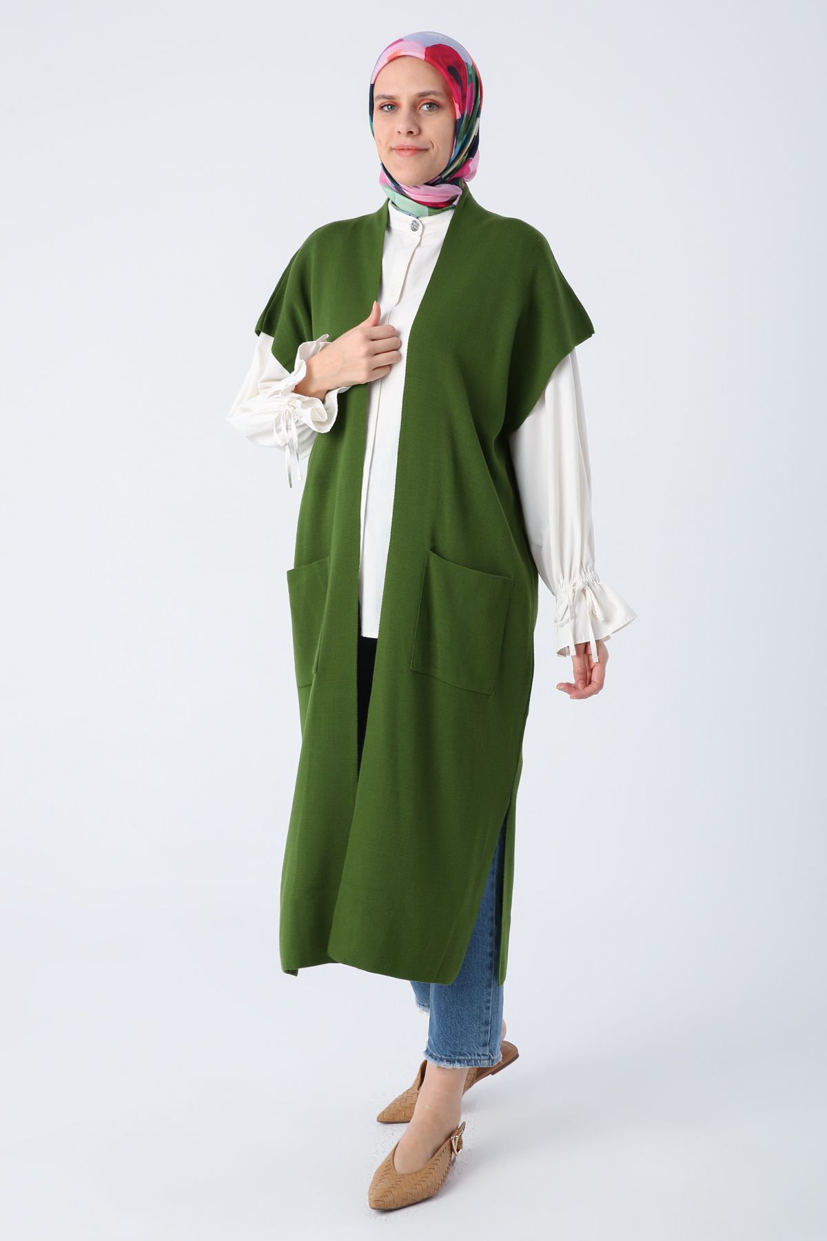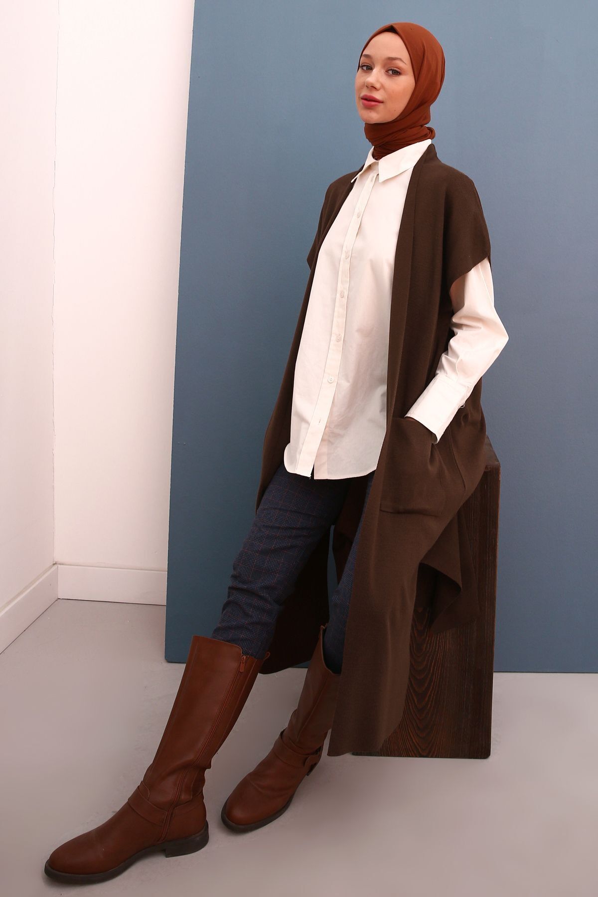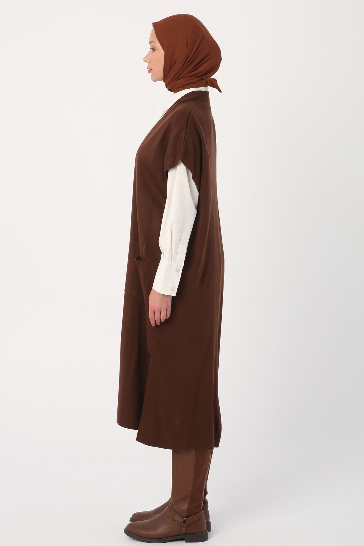 Kahve Cepli Uzun Triko Yelek