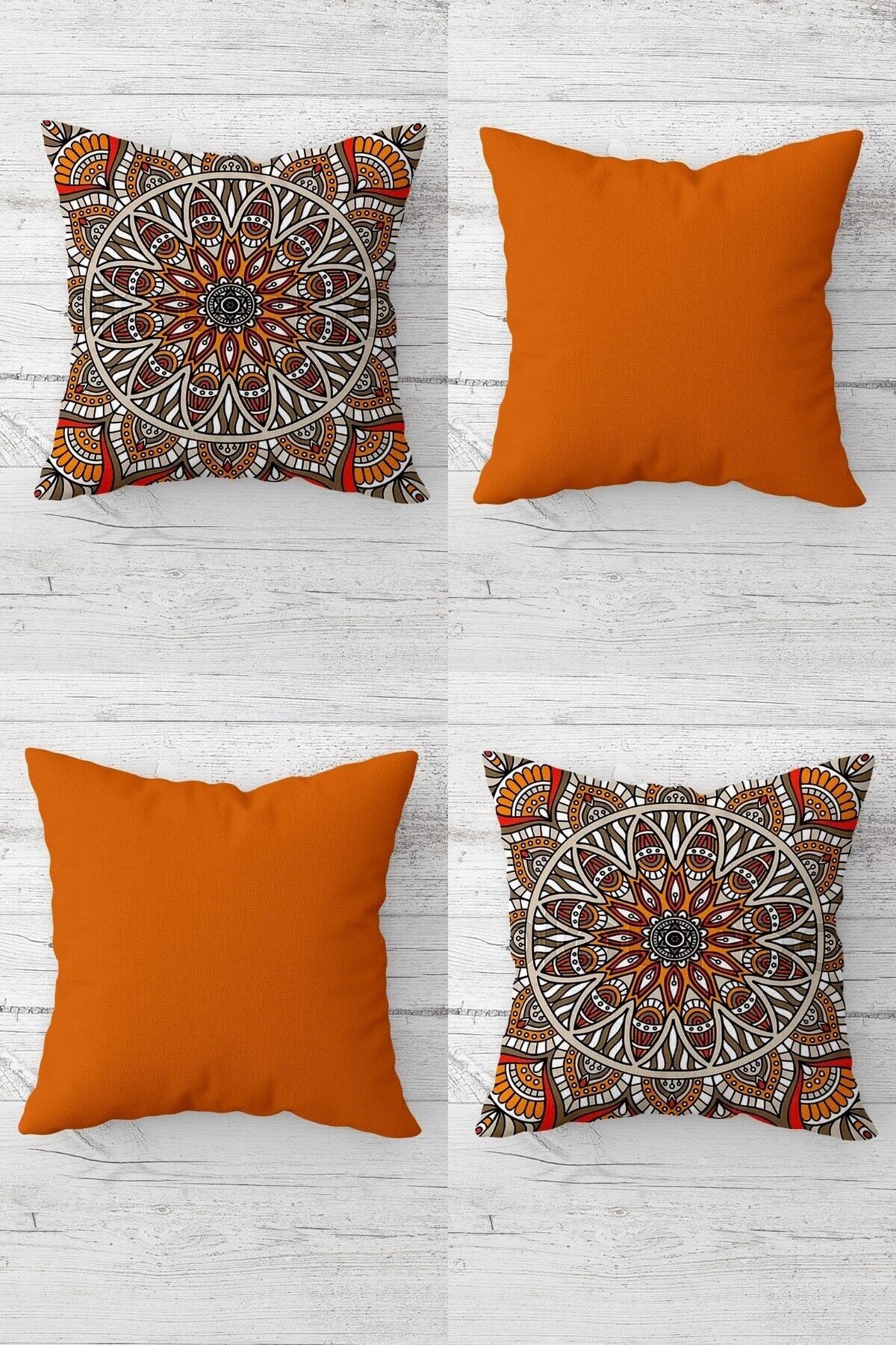 Modern tasarımıyla ev dekorasyonunuza şıklık katacak etnik desenli turuncu kırlent kılıfı, dijital baskı teknolojisi ile üretilmiştir