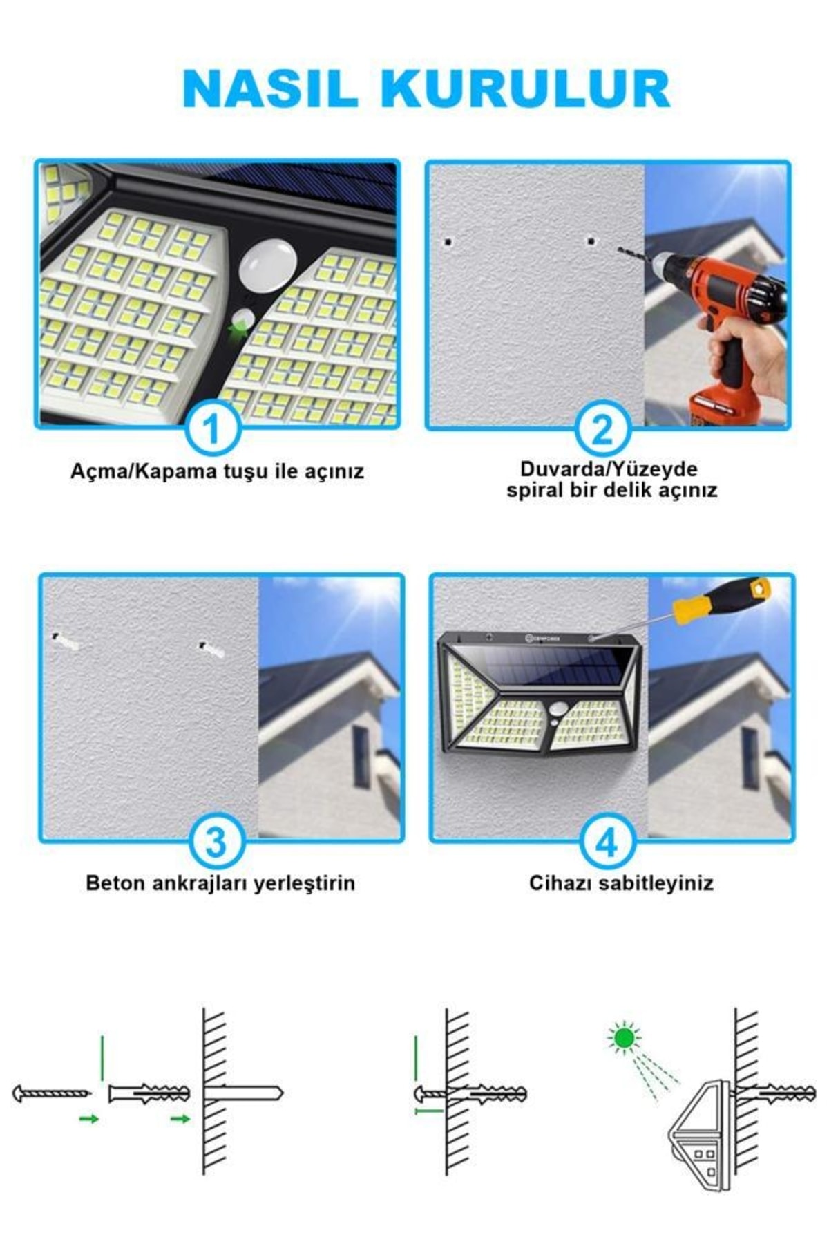 Kolay kurulum sağlanır, Su geçirmez, donma direnci ve ısı dayanıklığı mevcuttur. 270 derece aydınlatma açısı bulunur ayrıca 120 derece algılama açısı bulunmaktadır. 100 parlak led ışık içerir. Güneş enerjisi ile şarj olmaktadır. KURULUMU : Açma - Kapama tuşu ile açınız. Duvarda/Yüzeyde spiral bir delik açınız. Beton ankrajları yerleştiriniz ve cihazı sabitleyiniz. 3 farklı modu bulunmaktadır. 1- Güvenli Işık Modu ( Hareket Algılanması Yüksek Işık) - ( 20 s Hareketsizlik Işık Kapalı) 2- Loş Işık Sensör Modu ( Hareket Algılanması Yüksek Işık ) - ( 20s Hareketsizlik Her Zaman Açık + Loş Işık) 3- Gece Işık Modu ( Her Zaman Açık Loş Işık) Gün boyu güneş enerjisi ile şarj ediniz.
