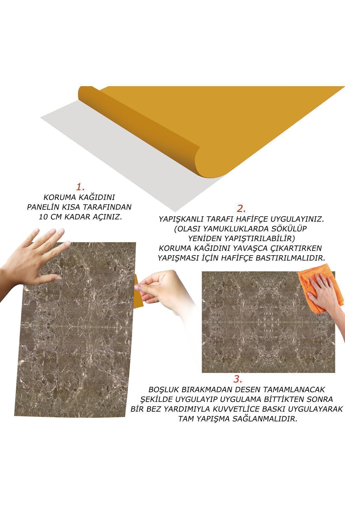 Pvc panelin arka yüzündeki koruyucu bandı çıkardıktan sonra sıkıca bastırarak uygulayacağınız zemin üzerine yapıştırın.